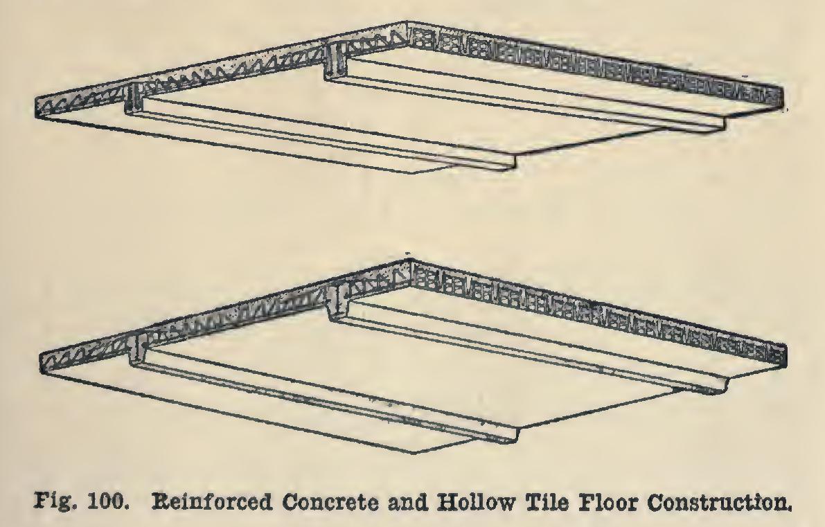 The second class comprises floors of such a construction that the girders and beams really constitute ribs for strengthening the slabs. These are monolithic constructions. As ex amples of this type, we have the Hennebique system shown in Figs. 99 and 99A; the Gabriel system shown in upper part of Fig. 100; the Kahn system shown in Plate 15; the American system shown in Fig. 78; the Unit-girder sys tems, and many others shown in the previous pages.
