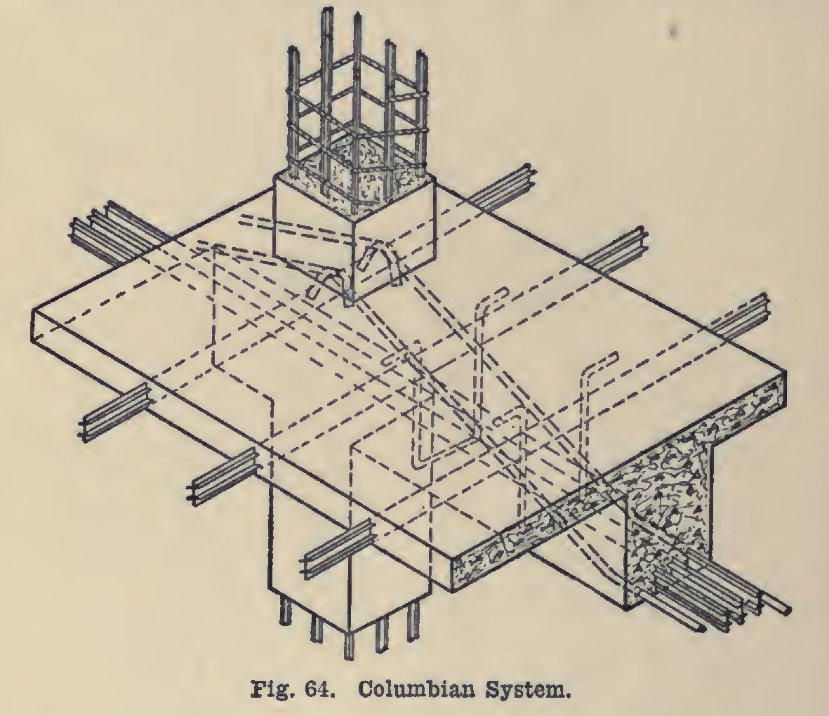 The Columbian System is shown in Fig. 64. The special forms of Columbian bars, and the methods of placing them in slabs, girders, and columns, are clearly illustrated.