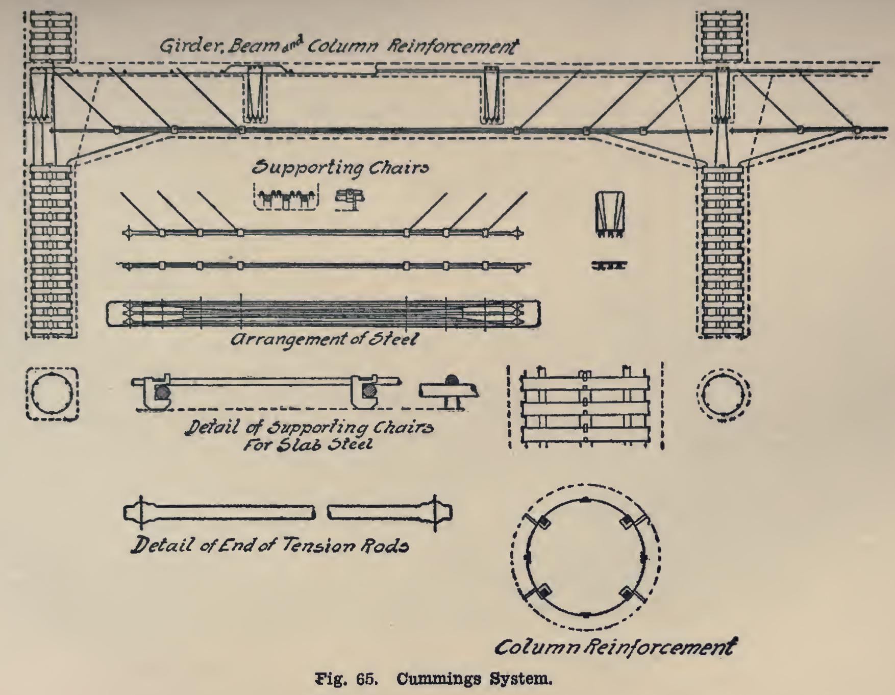 The Cummings System, invented by Mr. Robert A. Cummings, is in this special bar class. A number of reinforcement details are illus trated in Fig. 65. At the top of the diagram is shown the Cummings method of forming the bent-up bars and attaching them to the tension bars. In general the plan is to provide tension bars with ends specially anchored; while se, curely attached to them are small rods hori zontal in the middle of the beam or girder, but bent up, as indicated, to pass across the top of the beam and form inclined inverted U-bars or stirrups. The idea is more clearly shown in the sketches below of "Arrangement of Steel." The "Supporting Chairs," placed at the point of the bending up of the rods, are also drawn. For the slab steel, another type of supporting chair is employed, as illustrated in the detail sketch.