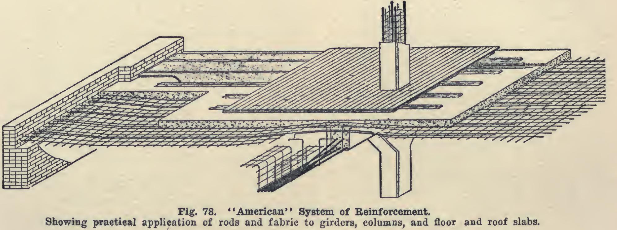 The American System consists in the use of plain round rods underneath woven wire fabric, both of high-carbon steel. Fig. 57 shows the type of fabric, and the clamp used in joining ends of sheets. Floors are designed in some in stances by stretching the parallel rods across steel girders, and simply laying the wire fabric on top of these, embedding all in concrete. In other structures, the monolithic type of caged concrete column and connected girder, all formed of rods and fabric embedded in concrete, is used, as in Fig. 78. In short spans and for light loads, the wire fabric is often used without the rods.