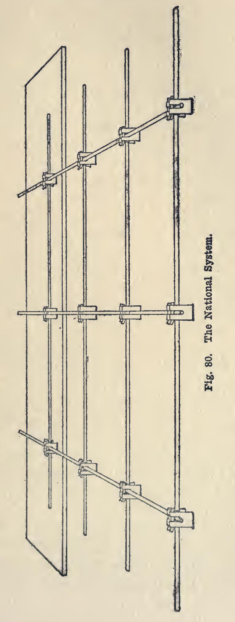Fig. 80 shows the rods or bars in place, fastened together with the National Chair, on the form. No part of the rods or bars, either cross or longitudinal, rests upon the form, thus permitting them to be thoroughly im bedded in the concrete.