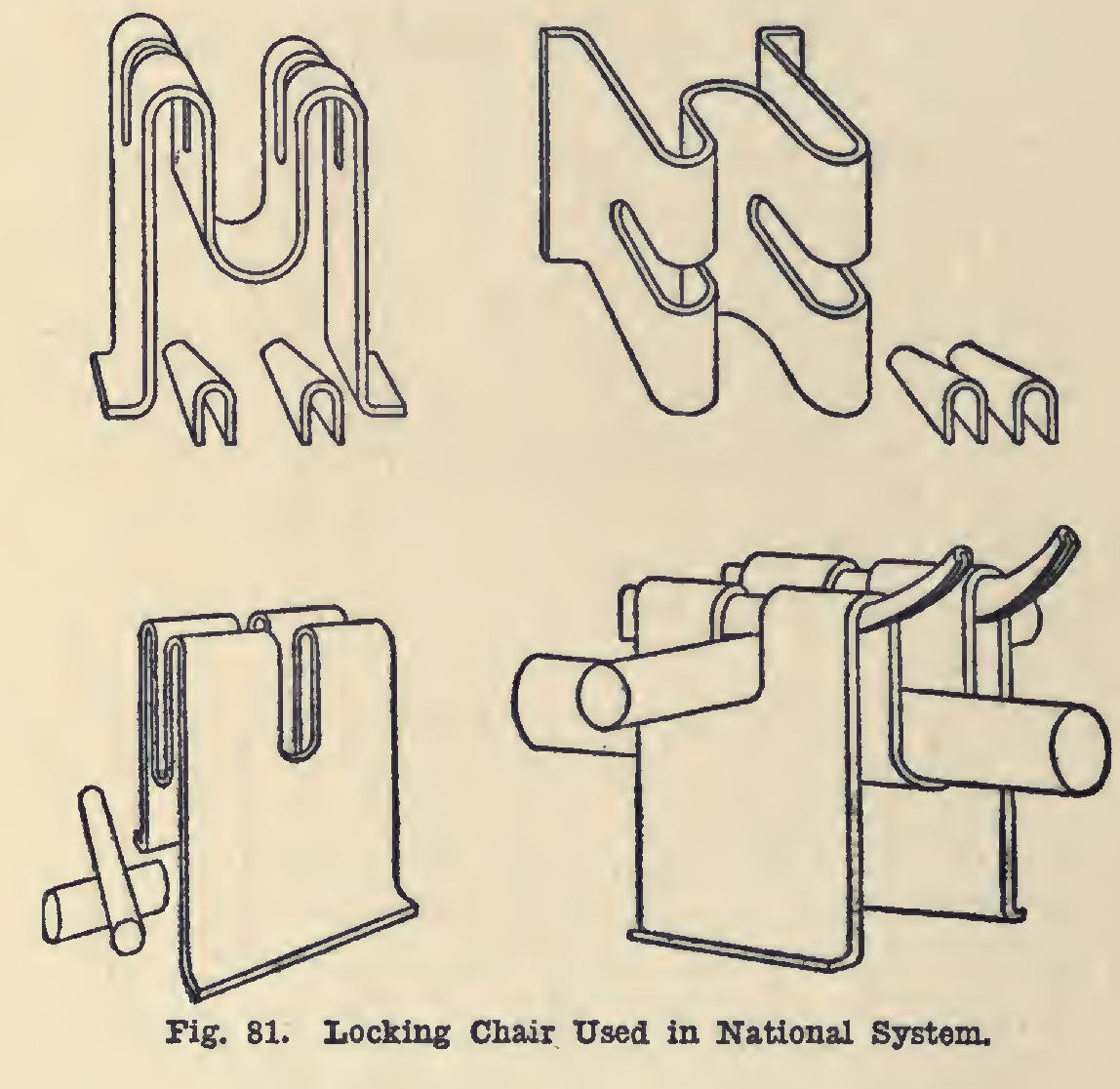 Fig. 81 illustrates the "chair" for locking the heavier wires and bars, the lower right diagram showing it assembled with the wedges turned up, making a perfect lock. The wedges are turned up with a very simple tool. The cut also shows the feet of the chair which keep it from sinking into the form. In spiral or column construc tion the feet of the chair are absent.
