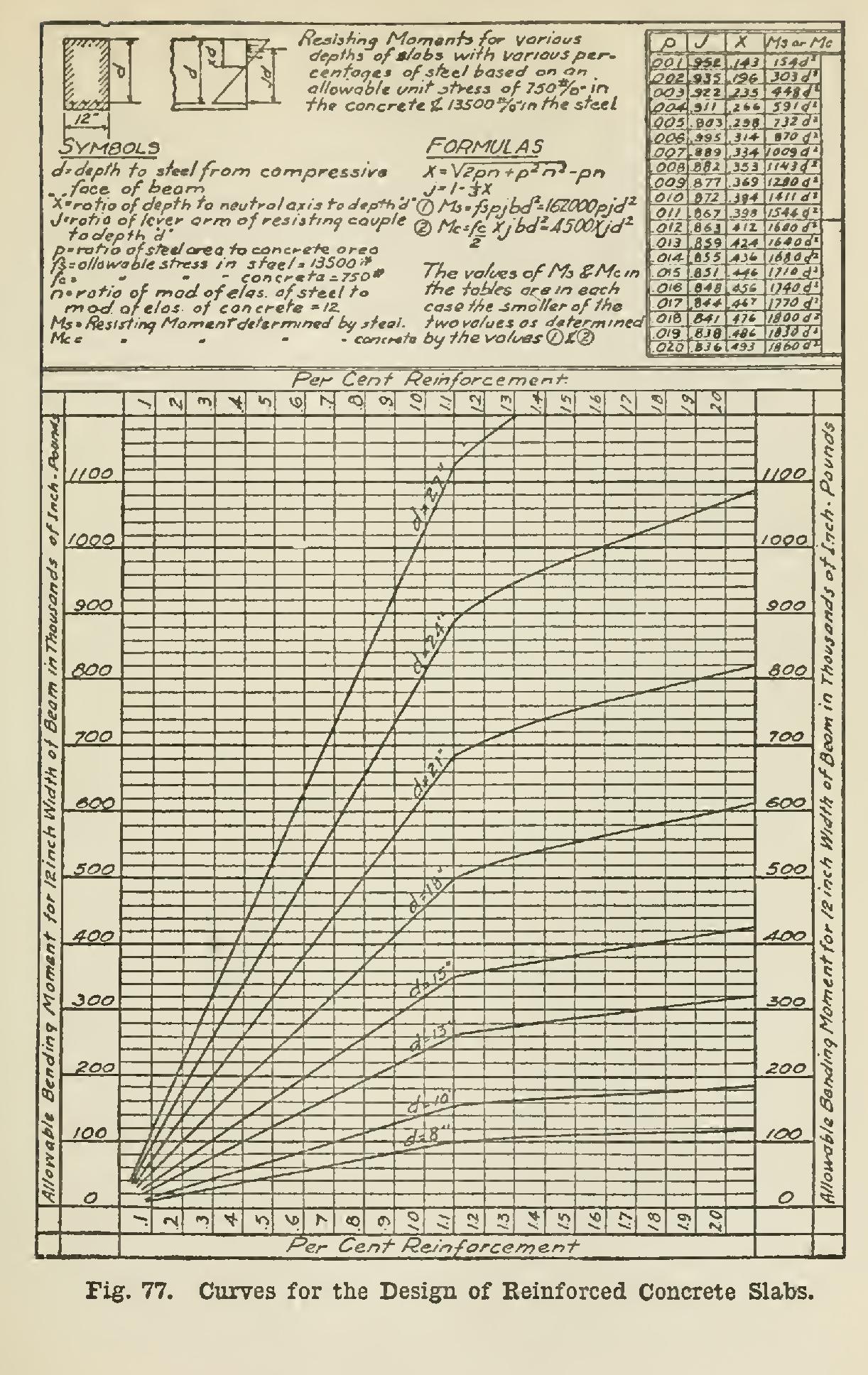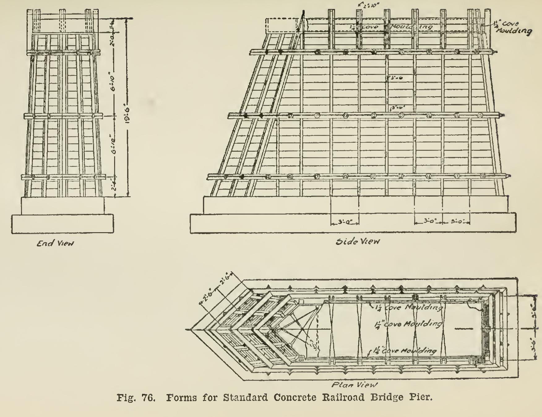 Fig. 74 is a standard drawing for a concrete pier showing a top view, side vie Nv, and section. On the top view may be seen the position of the bridge shoes or pedestals, and the general out line of the pier including the starling. The "Rules for Design" given on the diagram will assist in filling in some of the blank dimensions; the remainder will depend on the height of the pier, length of the bridge span, nature of the foundation, etc., and must be filled out before the carpenter can lay out his forms.