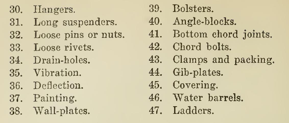 " (d) By engineering department whenever a struc ture is reported as requiring repairs or renewals." The items which are to be noted by the inspector, as required by the Oregon Short Line Railroad, are as follows: A somewhat similar list of items concerning concrete or stone arch bridges is as follows : The points to be noted are almost entirely cracks— their location, width, length, depth, and water-bearing qualities. Their location will determine to a certain ex