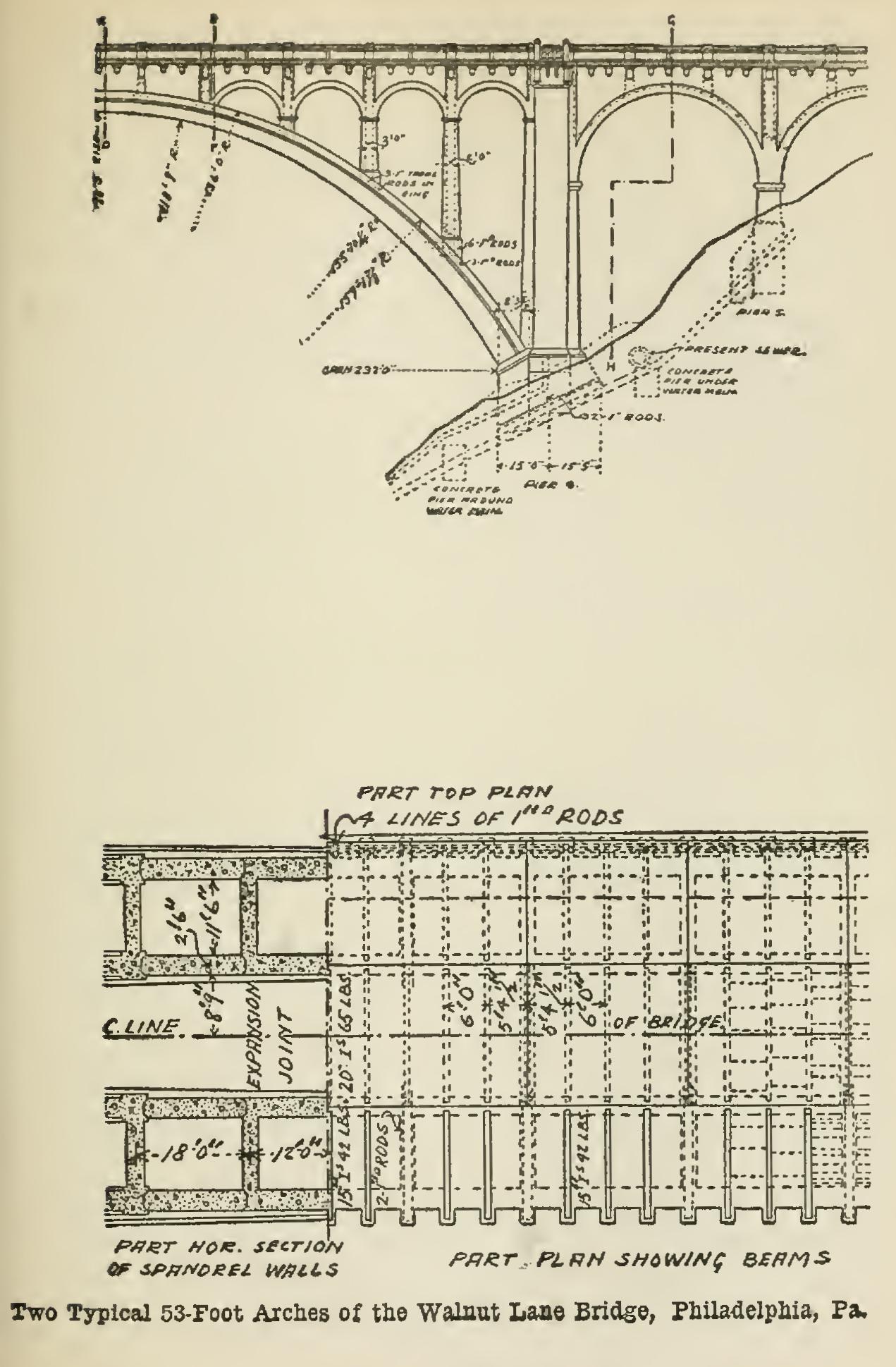 The abutments are reinforced near the bottom by one plane of 1-in. square rods parallel to the springing face of the arch and running transverse to the line of the bridge.