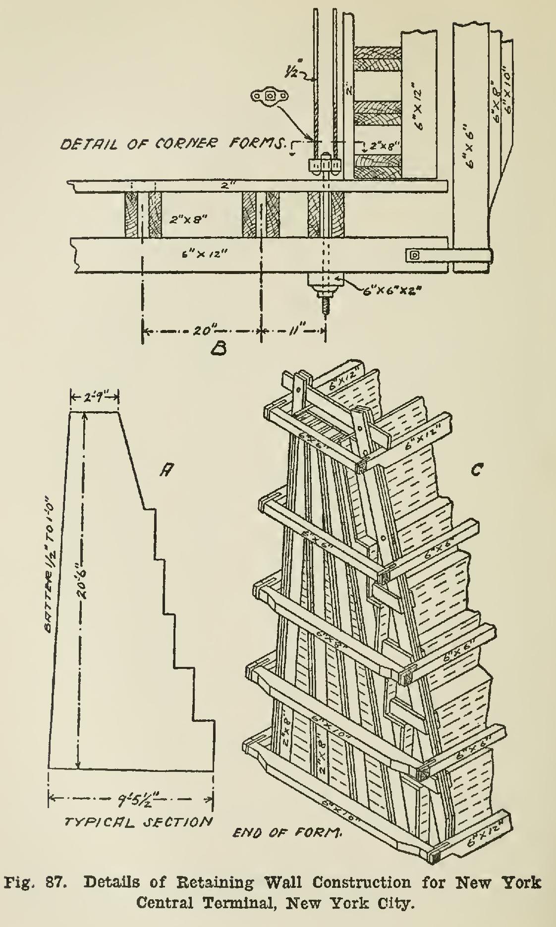 At the Grand Central Station of the New York Central Railroad, the yards have been ex tended to a total area of about 43 acres, and are depressed to an average distance of about 20 feet below the adjacent streets, being enclosed by a massive concrete retaining wall (see Fig. 87, A, B, and C). The wall varies from about 11 to 21 ft. in height, and has a batter face with rear offsets 3 ft. high, as shown in the cross-section. It is made in full-height sections about 52 ft. long, with open vertical transverse expansion joints in. thick between them. The moulds are built with horizontal 2-in. Virginia pine planks, ship-lapped 1/2 in., and laid in. apart to allow for swelling. They are lined on the face with thin steel plates, and are secured by vertical spruce joists and removable horizontal yellow pine waling pieces, bolted on as indicated in the illustrations. The front and end sheeting is made in single large surfaces; but the rear sheet ing is made in steps to correspond with the off sets, each one having a vertical and a horizontal part fitted to the framework like the tread and riser of a stair.