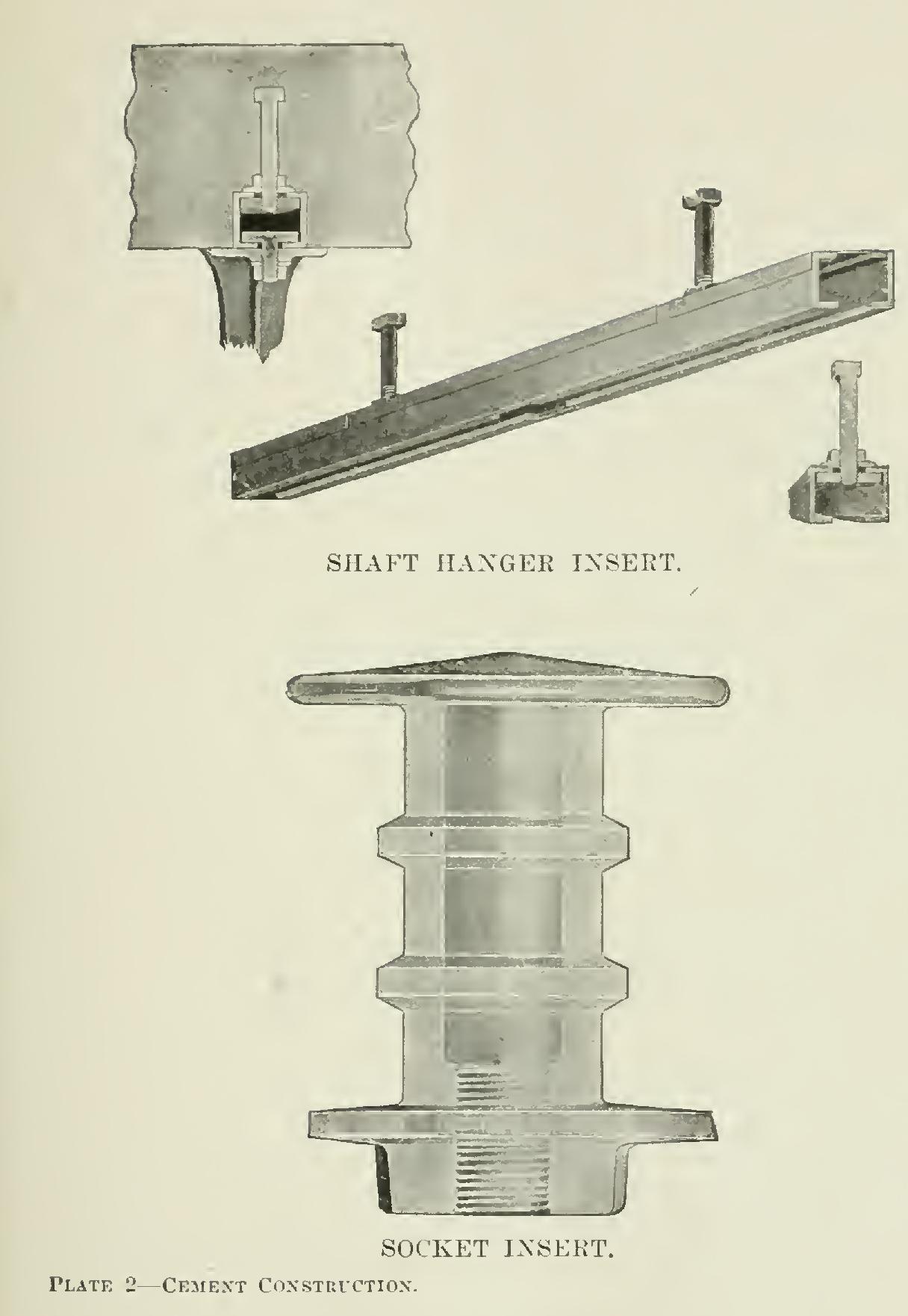 "Fig. 29 is adapted for floors where the concrete is flush or fair with the bottom flanges of the joists, and the latter are any distance not more than six feet apart. Clip hangers made out of steel bars about 1 by inch have a mortise through which iron bars B about by inch are passed; the bars arc fixed three or four feet apart, and inch boards are laid on them to uphold the concrete. The clips are driven on lightly with a hammer. The small wedges are to allow the bar B to be loosened and withdrawn, the boards liberated, and the clips removed.