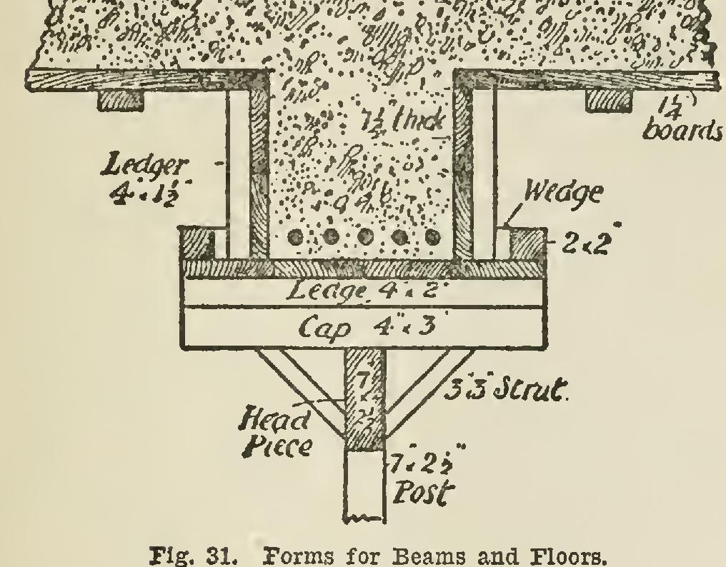 "Fig. 31 shows an arrangement of forms necessary for beams and floors. The posts should rest on a floor of planks at the bottom, and be placed as far apart as may be necessary. A pair of wedges under each post is necessary, and when released and the 2 by 2-inch wedges withdrawn, the whole of the timber work gives way.