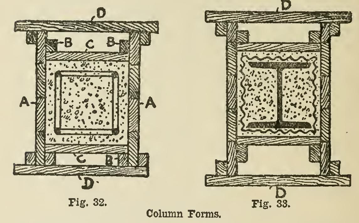 "Forms for concrete columns should be of a substan tial character, or—if of light construction—well and rigidly bound together, as, like water, concrete exercises pressure on all sides. Practitioners differ a good deal in their methods of making forms for columns. My own view for economy and simplicity is shown in Fig. 32, which is a horizontal section of a column form. The sides AA are inches in thickness and strongly ledged together at intervals to prevent the wet concrete from warping and twisting them. They should reach the full height of the column. B B are wood strips or fillets about 2 inches by 1 inch, firmly nailed to A the full height of the form, and each in one piece. C C are boards dropped in singly as the concrete is being deposited in place.