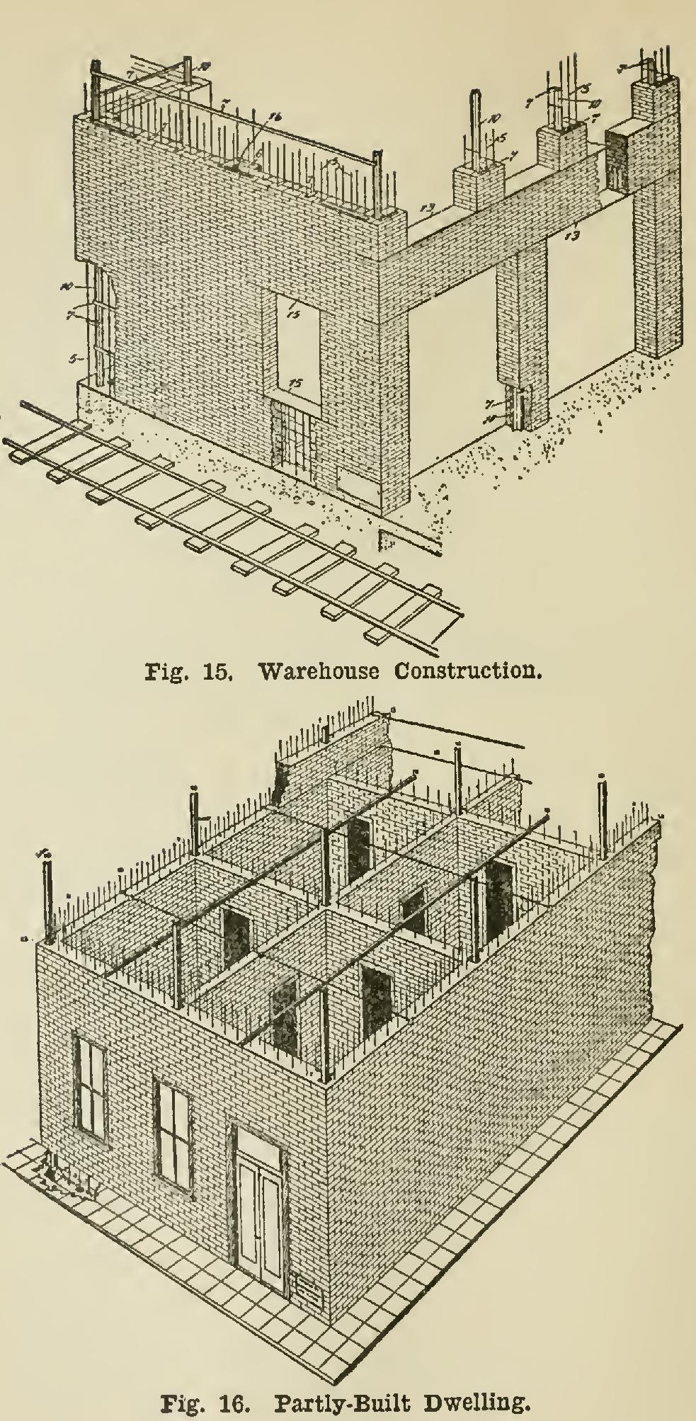 "A structure bonded together in the manner indi cated, and laid in the best cement or cement mortar, the joints being well grouted, has the extreme of rigidity and staunchness, and is capable of withstanding the severest shocks, twists, strains, and vibrations, rendering the high est buildings proof against the forces of the heaviest winds and storms.