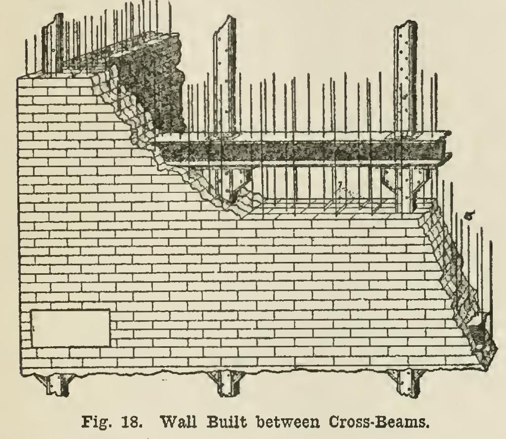 "This structure is particularly adapted for use in conjunction with a steel frame which is provided with lateral projecting plates at suitable intervals, say at each story, which extend part way between the courses of the brick, and are perforated so as to pass the vertical rods. The walls, being strongly braced across at each story by heavy metal rods or girders, give increased rigidity to the structure, especially in very tall buildings, the above plates being firmly welded, bolted, or riveted to the cruciform columns or steel frame.