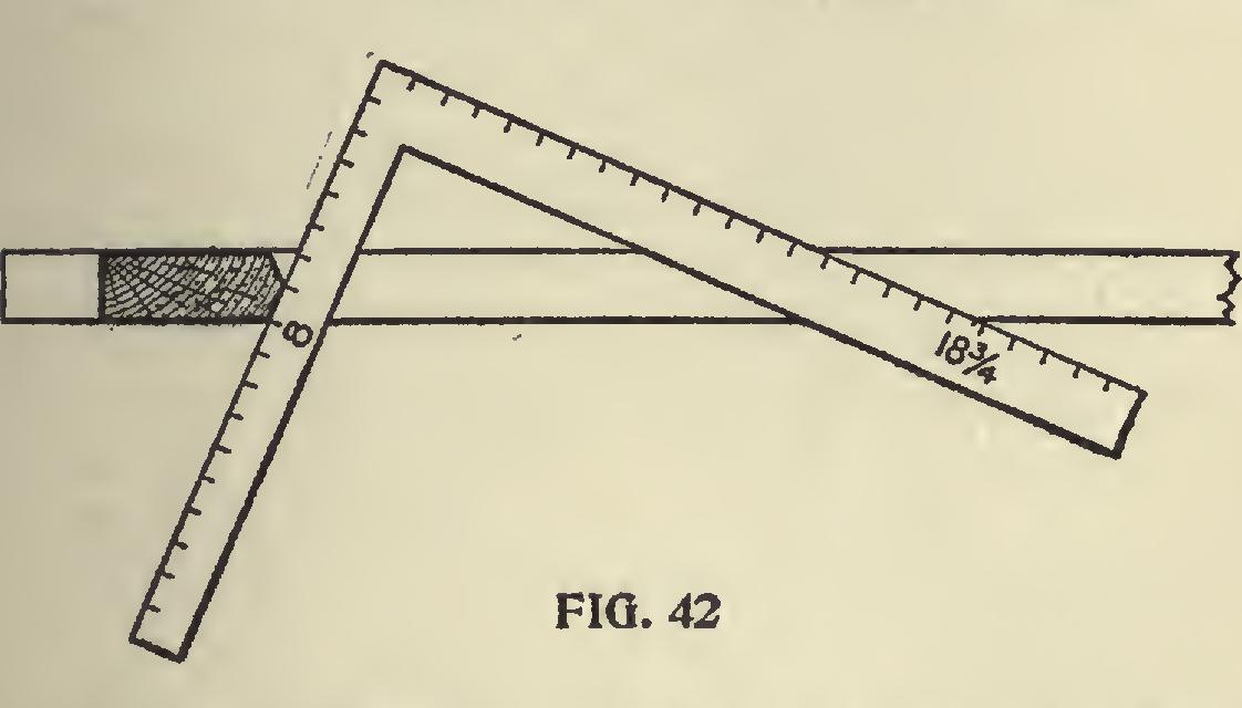 angle where it meets the ridge pole would be an angle of 45 degrees, but when a slope is given this angle becomes more acute. The rule is, take the length of the hip on the blade and its run on the tongue, the blade gives the cut or take 17 on the tongue and 18i on the blade, blade gives the cut as shown in Fig. 41.