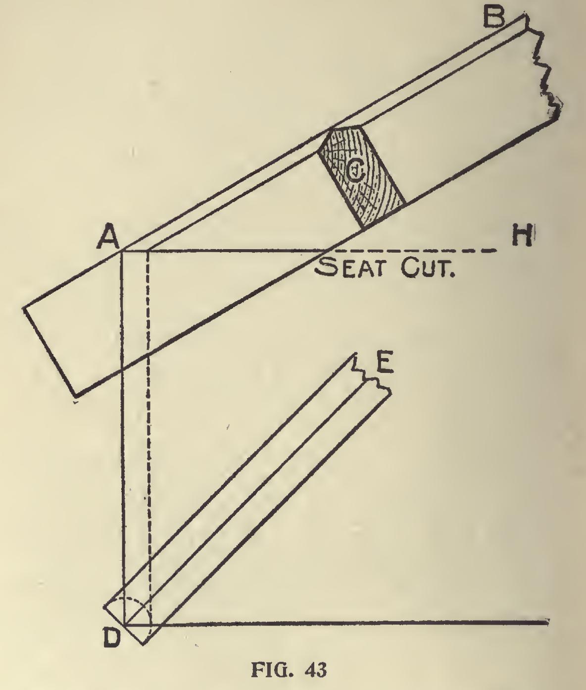 Fig. 43 applies to backing of hips where the corner is at right angles and the pitches are the same. At the angle D will be seen the inter section of the sides of the angle rafter with the sides of the plan.