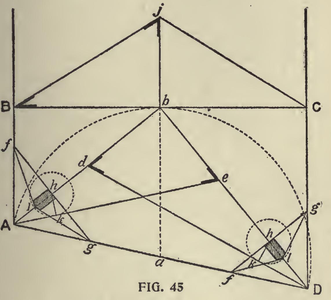 Bisect AD in a, and from a describe the semi circle AbD; draw ab parallel to the sides AB, DC, and join Ab, Db, for the seat of the hip-rafters. From b set off on bA, bD the lengths bd, be, equal to the height of the roof bj, and join Ae, Dd, for the lengths of the hip-rafters. To find the backing of the rafter: In Ae, take any point k, and draw kh perpendicular to Ae. Through h draw fhg perpendicular to Ab, meeting AB, AD, in f and g. Make 1 equal to hk, and join fl, gl; then flg is the backing of the hip.
