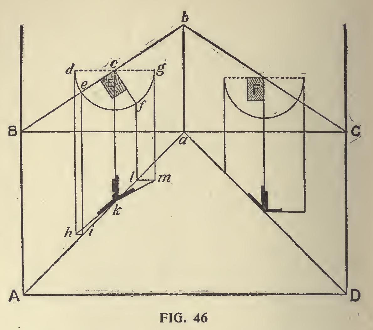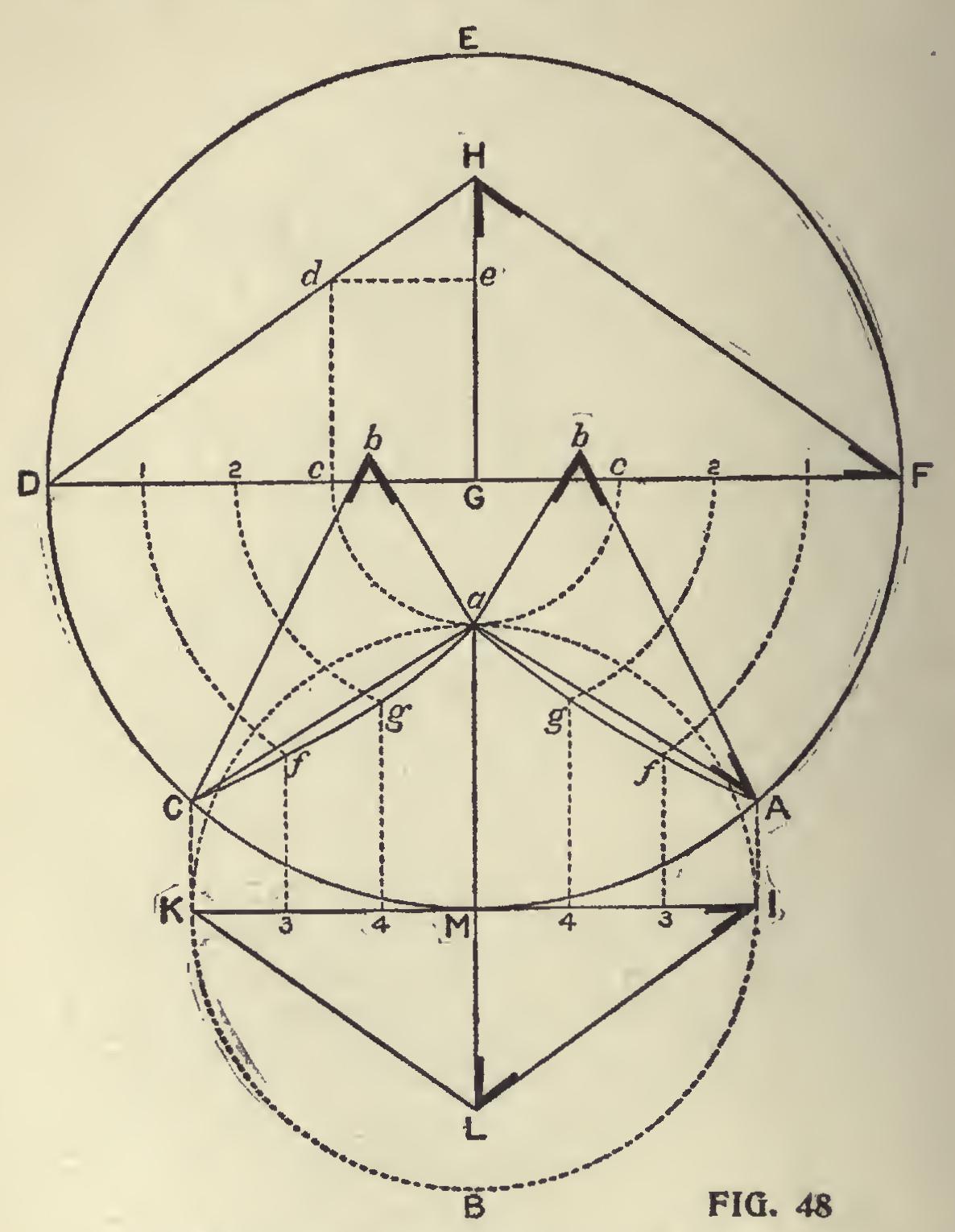 How to Find the Shoulder of Purlins.—Fig. 46 shows how to find the shoulder of purlins: First, where the purlin has one of its faecs in the plane of the roof, as at E. From c as a center, with any radius, describe the arc dg; and from the opposite extremities of the diameter, draw dh, gm perpendicular to BC. From e and f, where the upper adjacent sides of the purlin produced cut the curve, draw ei, fl parallel to dh, gm; also draw ck parallel to dh. From 1 and i