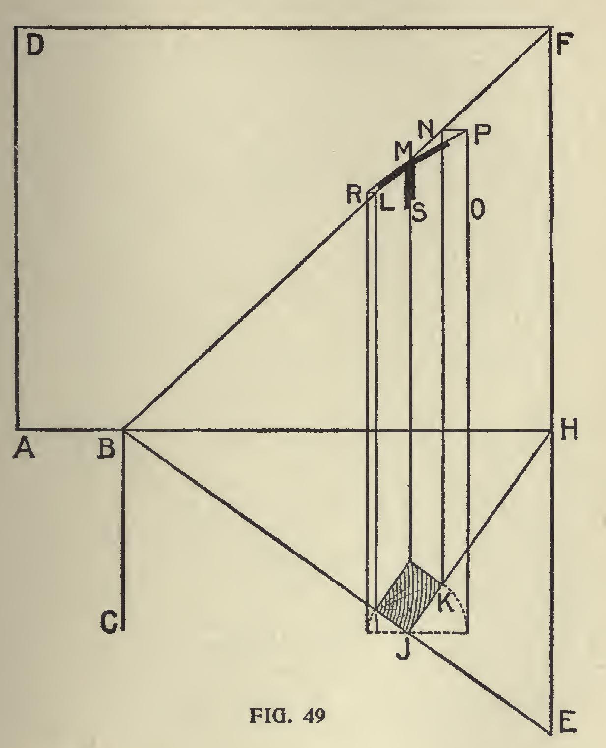 Fig. 45 shows the method of obtaining the backing of the hip where the plan is not right angled.