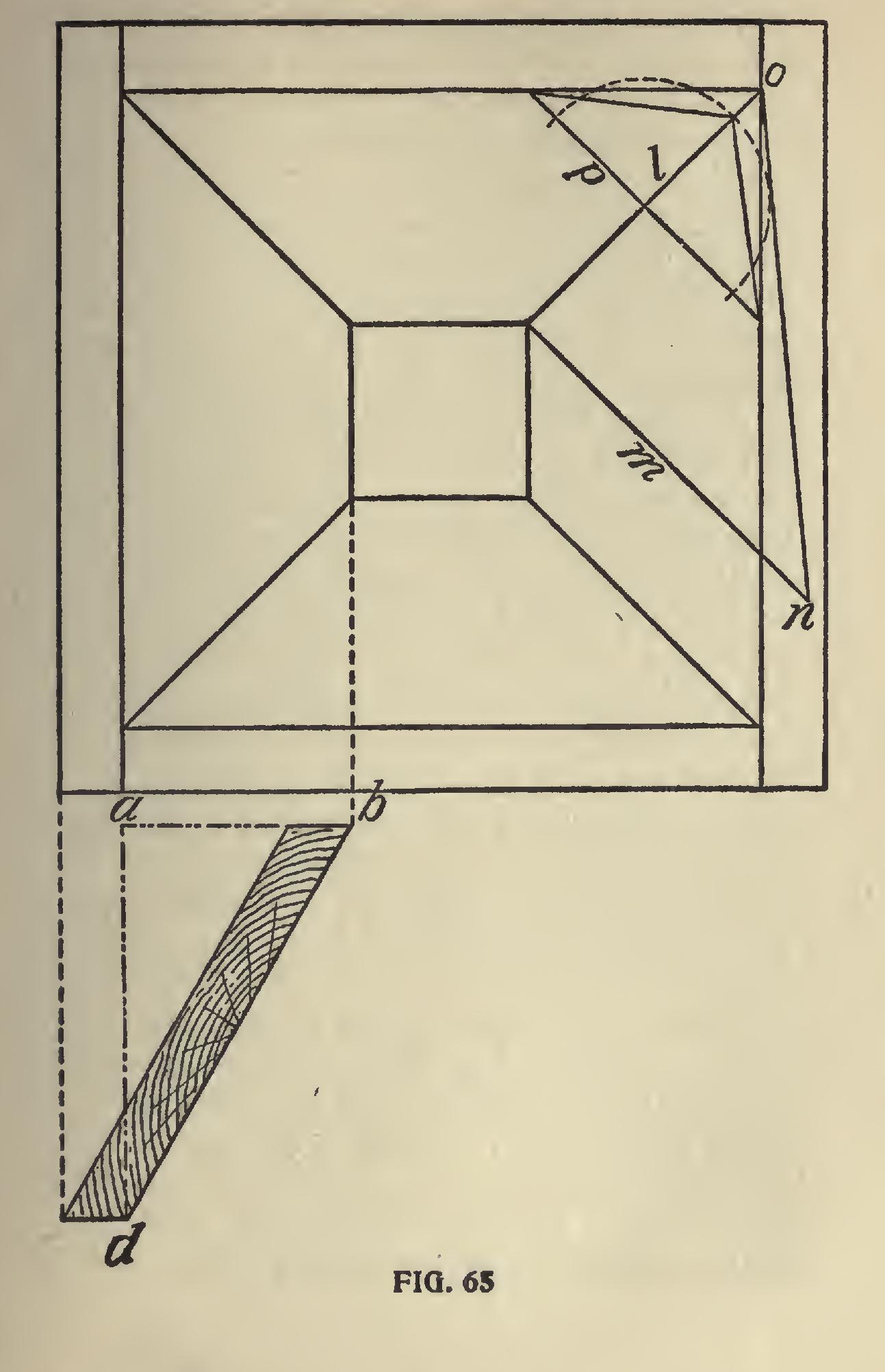 In Fig. 65 the large square represents the upper edges of the hopper and the small one the lower edges or base. The width of the sides and ends is found in this way: Take the run ab on the tongue, and the perpendicular height ad on the blade. It is thus found in the same manner as the end of a brace. To find the cut for a butt