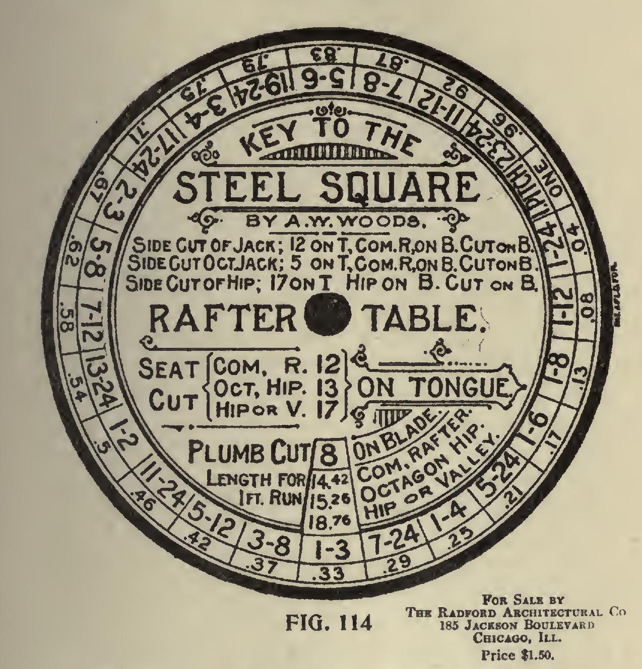The subject of and the part they play in Carpentry and Joinery has been overlooked by woodworkers in general. Every carpenter should understand the divisions of the circle called degrees, and the relation they have to the steel square. When this is understood, it is just as easy to frame a roof for any kind of angled building, giving all of the cuts and bevels, as it is for the square-cornered building. The same rule applies to all, without the aid of any other instrument than the common steel square. How to apply the steel square is well explained in the little device recently placed on the market and known as the "Key to the Steel Square," by A. W. Woods, of which the following pages are a brief description.