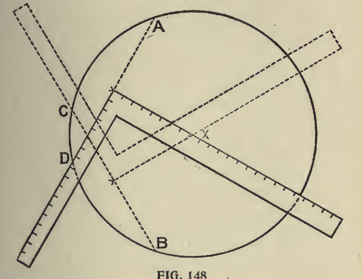 points, then draw a line from A to D, and from B to C; get the center of these lines, and square from these circles as shown, and where the square crosses the line or where the lines intersect, as at X, there will be the center of the circle. This is a very useful rule, and by keeping it in mind the mechanic may very frequently save himself much trouble, as it often happens that it is neces sary to find the center of the circle, when the com passes are not at hand.