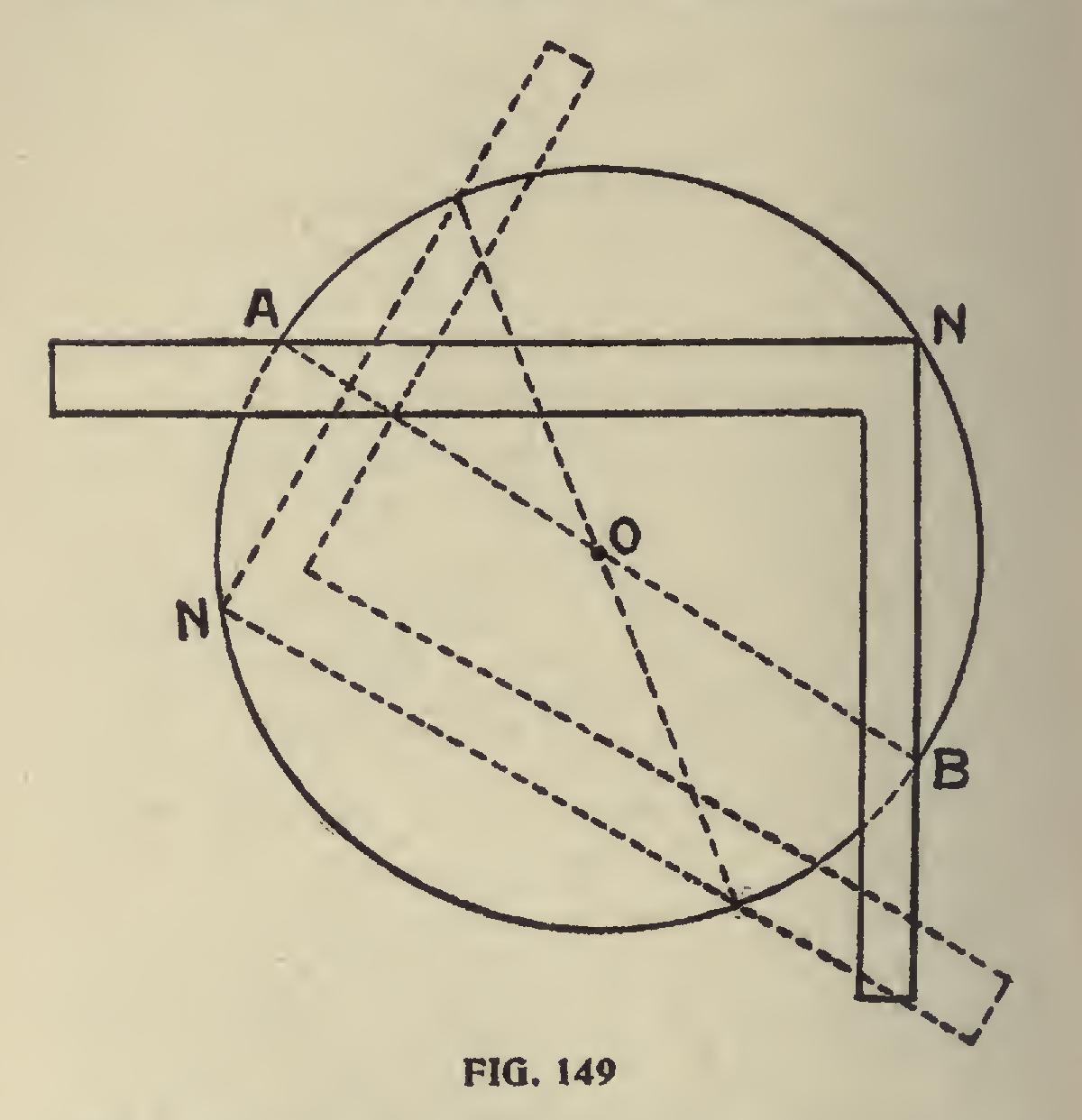 To Determine Proportions of Cylindrical Bodies. —In Fig. 147 is shown a method to determine the proportions of any circular presses or other cylindrical bodies, by use of the square. Suppose the small circle, N, to be five inches in diameter and the circle R is ten inches in diameter, and it is required to make another circle, Z, to contain the same area as the two circles N and R. Meas ure line a, on the square, from five on the tongue to ten on the blade, and the length of this line A from the two points named will be the diameter of the larger circle Z. And again, if you want to run these circles into a fourth one, set the diame ter of the third on the tongue of the square, and the diameter of Z on the blade, and the diagonal will give the diameter of the fourth or largest circle, and the same rule may be carried out to infinite extent. The rule is reversed by taking the diameter of the greater circle and laying diag onally on the square, and letting the ends touch whatever points on the outside edge of the square. These points will give the diameters of two circles, which combined, will contain the same area as the larger circle. The same rule can also be applied to squares, cubes, triangles, rectangles, and all other regular figures, by taking similar dimensions only; that is, if the largest side of one triangle is taken, the largest side of the other must also be taken, and the result will be the largest side of the required triangle, and so with the shortest side.