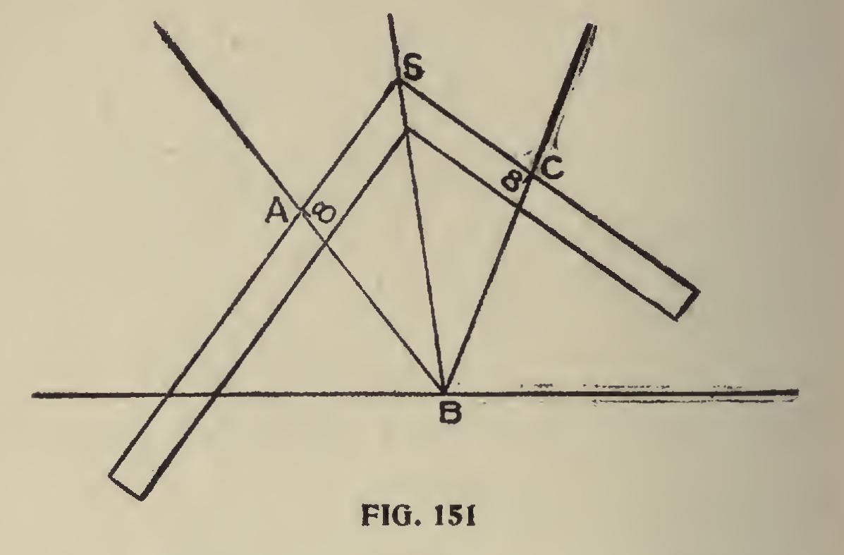 Method of Dividing Angles.—A B C, Fig. 151, is an acute angle. We wish to divide it. Measure up from B to A any distance, make B C the same distance, place the square on the points as shown on A and C, keeping the distance on the blade and tongue the same, then the heel or corner of the square, S, will give the points through which to draw a line passing through the angle at B, and the division will be complete.