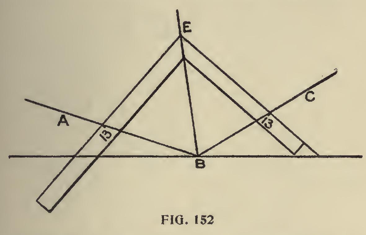 Again: Let Fig. 152 be an obtuse angle; make B A and B C equal. Apply square as shown, keeping equal distances on the blade and tongue at the points of contact A and C. The point E on the heel of the square will be one point from which to draw a line through B, which forms the division of the angle.