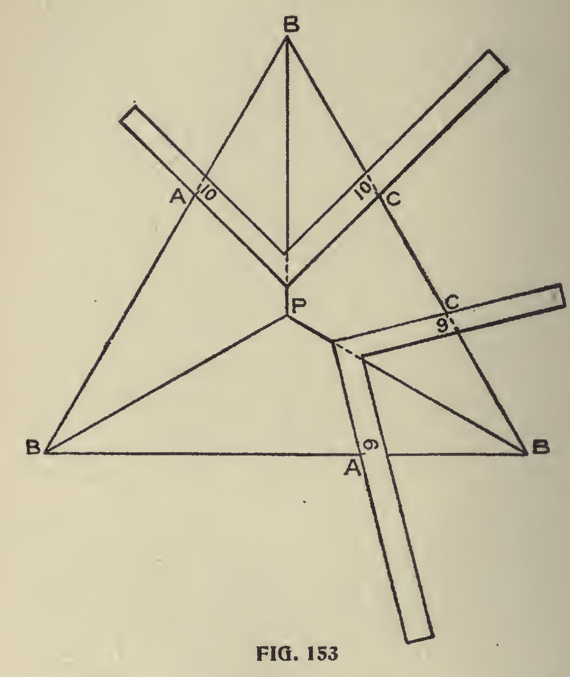 In Fig. 153 we show a number of angles, which are treated same as the foregoing. At the junc tion of the lines drawn from the angles B B B, the center of the triangle is found at P.