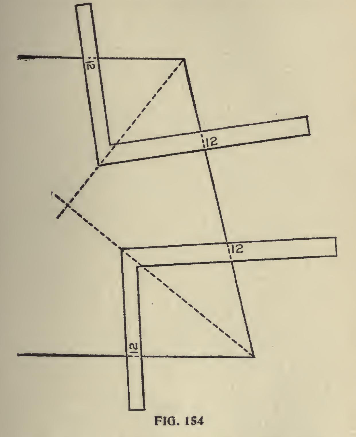 This method of bisecting an angle is very use ful, inasmuch as the cut or miter of any mouldings placed at any angle on a flat surface may be obtained. This is shown at Fig. 154, which may