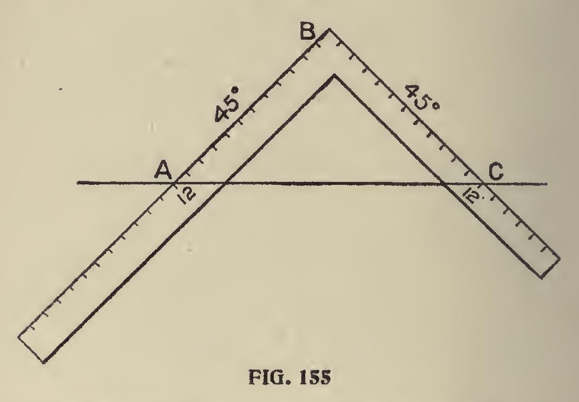 To Form a Template or Set Square.—Suppose we want to find the angle 45 degrees on a board, we mark any two points A C, Fig. 155, on the edge of a board; apply the square as shown, keeping its sides on A C ; then the distance on each side of the square being equal, measuring from its heel or corner B gives the angle 45 degrees. If this portion be cut out it will form a templet or set square, which is very useful in drawing. The lines A B and C B are true miters, or angles of 45 de grees, with the line A C as their base.