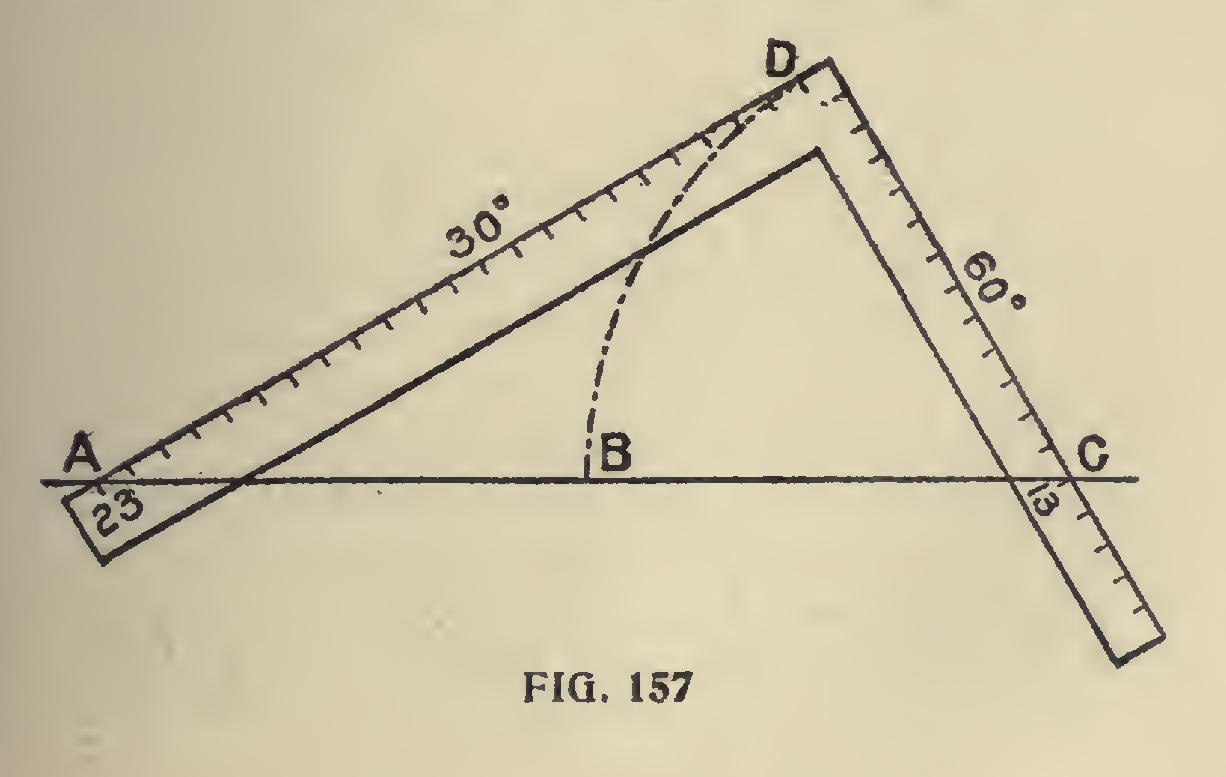 In Fig. 156, A, B, C, R show the lines for form ing a set-square having 60 degrees on the line C R, and 30 degrees on A R. This figure is formed with compasses, as follows : Make A C length of base line; let B be half the distance between A C. From C B as centers and radius make the in tersection at R, then by joining A R and C R the angles 30 degrees and 60 degrees are formed. This is the principle. To do all this with the square, simply take 23 inches on the blade and 13 inches on the tongue, and place these points on the line A B C, Fig. 157, and you have the angles at once. If the figure is greater than the square can cover, then continue the line A D to the length required; then square down until the line cuts A B C, and the work is done. If a smaller figure is wanted, measure off on A D, or A B C, and square over.