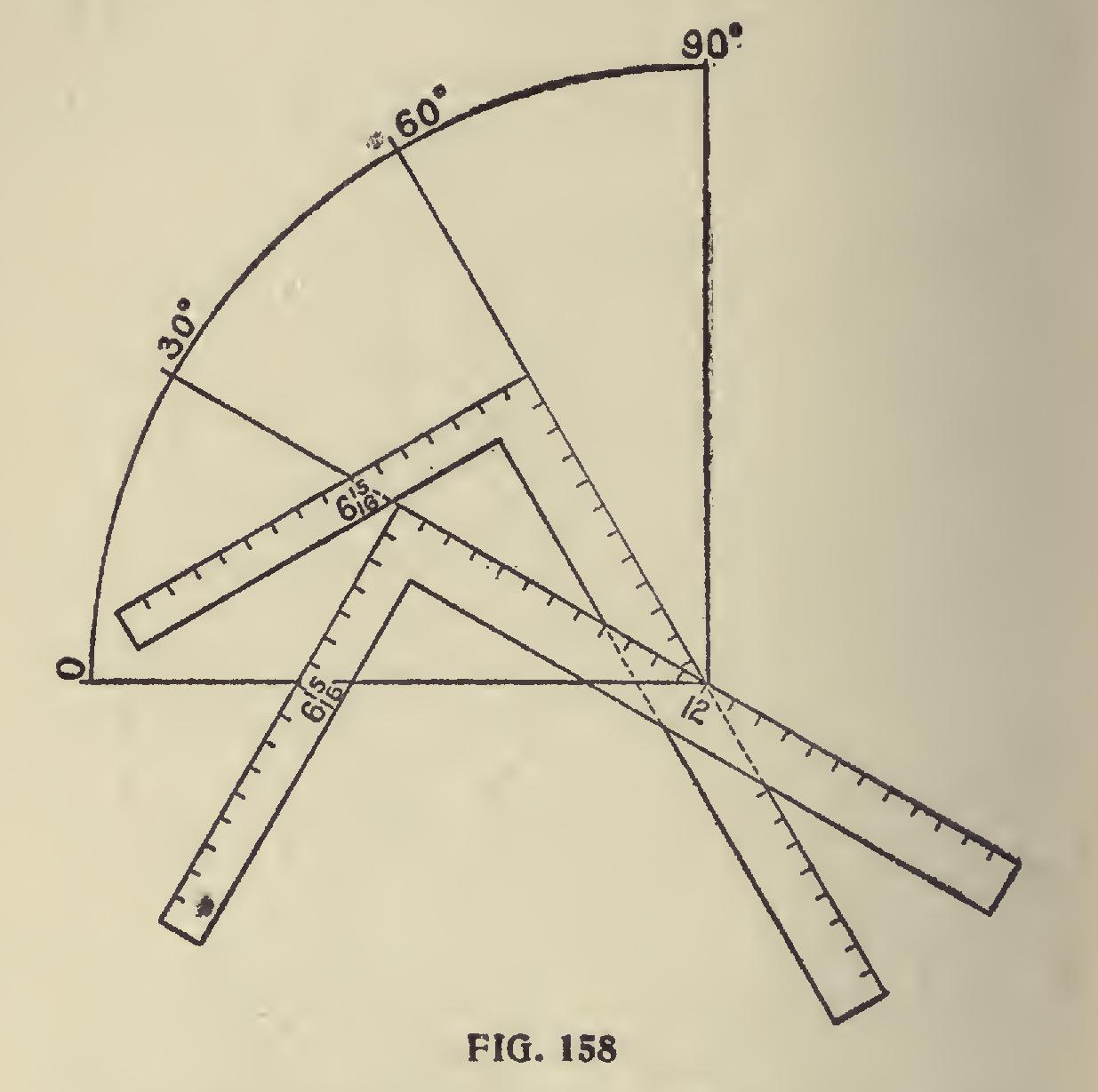 In Fig. 158 we show a quarter of a circle tri sected or formed into angles of 30, 60 and 90 de grees: 12 and 6 and 15-16 by the square will give 30 degrees and the remainder will be 60 de grees. These are things to remember, as the car penter and joiner will find them very useful in his everyday work.