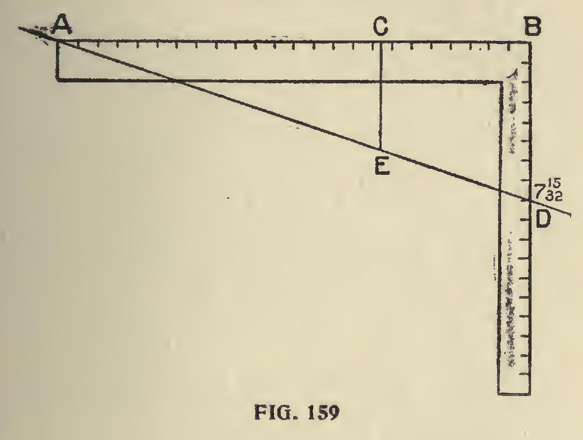 Other Methods of Obtaining Circumference of Circles of Given Diameters.—Fig. 159 shows how the circumference of a circle may be obtained by the square, the diameter being given. The solution of this problem by use of the steel square has been attempted by a number of writers on carpentry. It is not claimed that absolute' cor rectness is obtained in the following way, but it is claimed for this method that it is the nearest ap proach to correctness yet made by using the steel square. The method is not new, it having been employed for a number of years. Let A D rep resent the straight edge of a board, say 10 inches, or 12 inches wide; place the end of the blade of square at A, and let D on tongue be 7 and 15-32 inches. Take three diameters from A to C, and square down a line from C, cutting A D at E; then A E equals the circumference. A circle whose diameter is eight inches would have a circum ference equal to the line from A to D by this rule. It will be seen by this that any right angle whose base is 24, and having an altitude of 7 and 15-32, forms a constant by which any circumfer ence may be obtained by spacing three times the diameter on the line A B, and squaring down as at C, the hypothenuse being the required answer. The line A B may be continued indefinitely, being careful to retain the proper angle as shown in diagram.