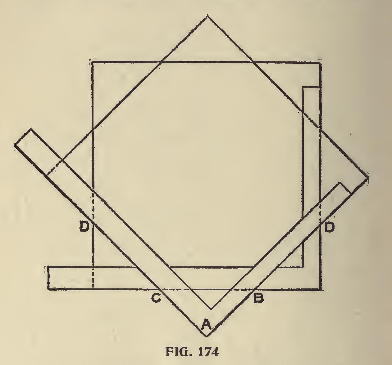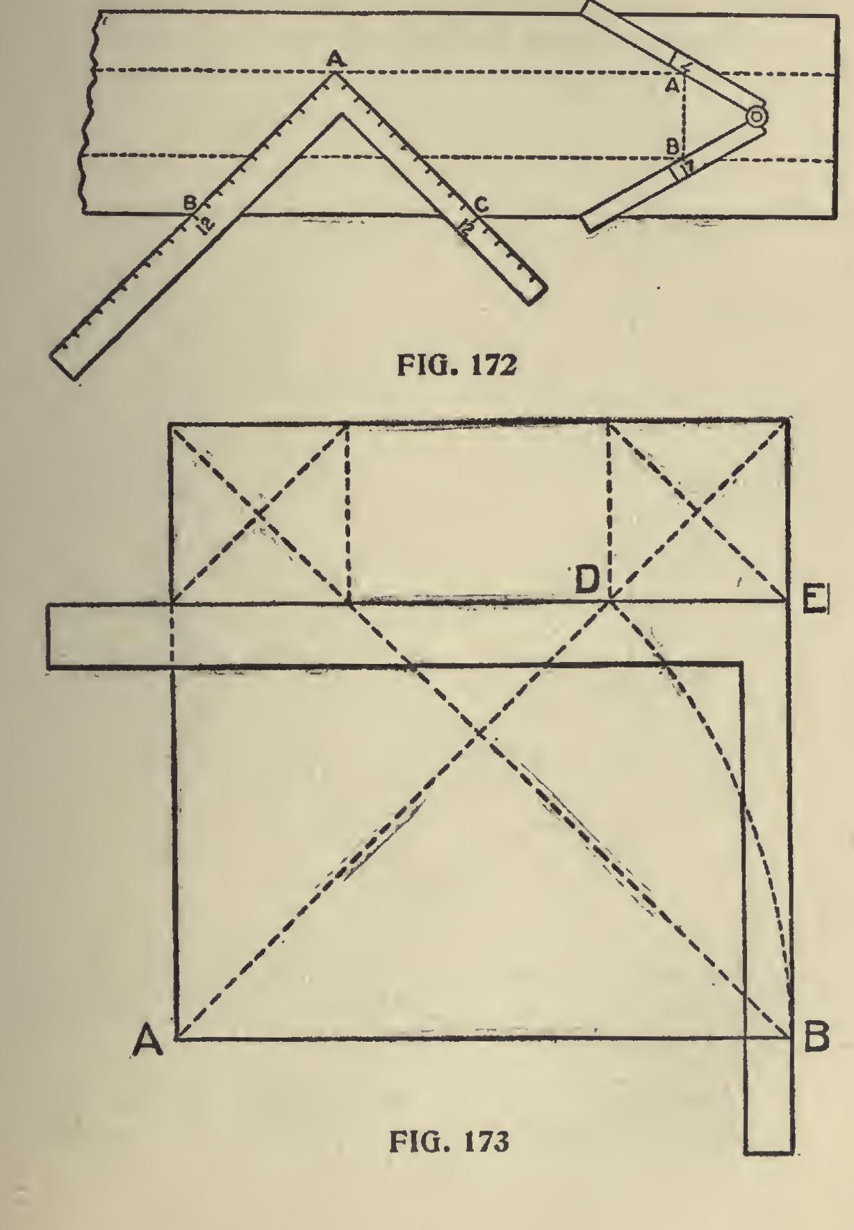 Another method (Fig. 174), is to draw a straight line, c b, any length of desired side ; then let a b and a c be corresponding lengths on the blade and tongue of the square, mark along either and move the square and mark also. Now use the square the same as before, and the marks d c and b d will equal c b.