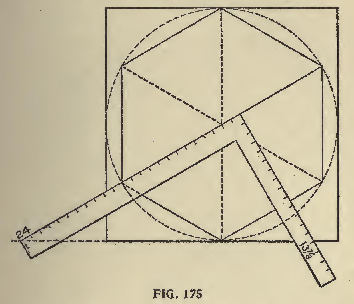 It may be necessary to explain that in regular equal-sided polygons the angles are equal, so any side of a regular polygon may be used for a base line. Let this fact be remembered, as it is im portant the student should keep it in mind when dealing with any problem connected with polygons, where the steel square is used : By careful examina tion of Fig. 176 it will be seen that the outer edge of the tongue of the square is in line with one side, A E, of the pentagon, measuring down below the base line, A B, six and one-half inches; then the 20 inch mark on the outer edge of the square will also touch the base line, A B, This position of the square then gives the exact inclination of the side of the pentagon with the base. Now if we reverse the square and place the 61. inch mark at B, and the 20 inch mark on the line A B, we give three sides of the figure. Now make the distance from A to E the same as A B, and we have the length of that side. Perform the same operation with B C. Then using A E and B C as base lines, we can form the complete figure. This shows how any pentagon having equal sides can be formed with the square.