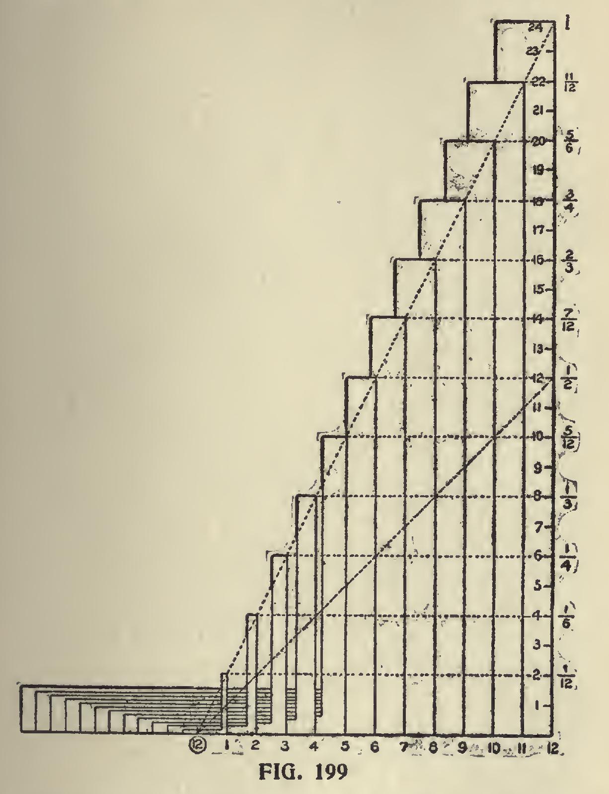 case must naturally follow when other figures are taken on the blade. Comparing it with the above method, twelve whole things would only be one half of a thing. Six whole things are one-fourth of a thing, etc. In saying this we do not mean to be understood that we are trying to introduce some new fangled theory about pitches; far from it. We take it as is usual in the accepted practice and analyze it. In other words, if there is such a thing as one-quarter, one-third, one-half, three quarter pitch, etc., then there must be a full pitch. This is arrived at by reckoning the rise given the common rafter in proportion to the span or width of the gable. It is therefore a full or a whole pitch when the rise equals the span. Taking it on the square ;—the run being 12 inches, the span must necessarily be 24 inches and since the blade is 24 inches long, then the figures on that member are to the pitch as to its own (blade) length, and that is all there is to it. Then a line drawn from 12 on the tongue to each of the inch divisions on the blade will represent as many fractional pitches. These lines diverge from one another taken on the vertical line at the rate of one-twelfth of an inch to each inch in run. So at the twelfth-inch back from the starting point, the lines are 12-12 or one inch apart and intersects the blade at the inch divisions and represents the full scale for a one-foot run for all GS the pitch lines. Now let us look at the figures on the blade of the square, as shown in Fig. 198, and see what relation they bear to those on the tongue. These figures as before explained represent the rise given the common rafter to a one-foot run. The fractional numbers to the right of the blade represent the proportion of the pitch. Now fol low the horizontal dotted lines from these figures over to the full or one pitch, thence down to the desired pitch and the figures at this point and those in the run taken on the square will be to the same proportion as those for the full scale, but at different points on the square. For illustration see the one-half pitch.