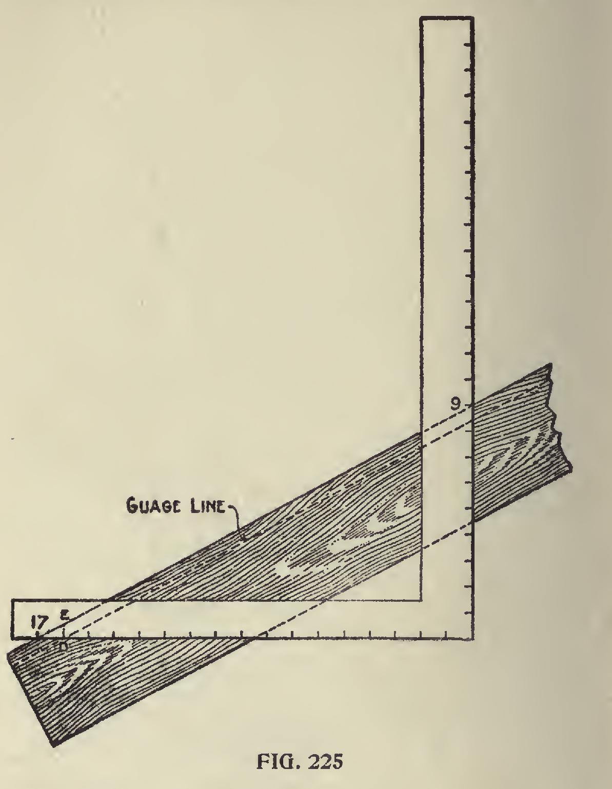 In Fig. 224 we show the hip and valley under different conditions for a square-cornered building. Beginning at the bottom is shown the plan of the rafter. The cross lines on same represent the angle of the plates for either hip or valley. Above the plan is shown the elevation. The sections 1-2-3-4 represent the position of the rafters under the fol lowing conditions: No. 1, hip when not backed; No. 2, hip when backed; No. 3, valley when not backed; No. 4, valley when backed. No. 1 is outlined by heavy lines and apparently sets lower than the others. By tracing the bottom line of the sections down to the seat of No. 1, thence up to the second elevation, will show just how far in the seat cut should be for each rafter. No. 1 cuts into the right-hand ver tical line above the plan, as at C, which would make it stand at the right height above the plate, at the outer edge of the rafter, but in order to make the seat cut clear the corner of plate, it is necessary to cut into the center line B. No. 2 cuts into the same point as No. 1 ,but owing to its being backed, the seat cut drops accordingly. No. 3, which is for the unbacked valley, also cuts into the center vertical line, and in order to clear the edges of the plate, must cut out at the sides to the left vertical line. No. 4 cuts in the same depth as the latter, but as much lower than Nos. 2 and 3 as they are below No. 1. The vertical lines "A" and "C" from the plan represent the width of the rafter. Therefore, if the rafter be two inches thick, the lines A-B-C would be one inch apart, and this amount set off along the seat cut, or a line parallel with it, will give the gauge point on the side of the rafter. To make this clearer, we refer to Fig.225. 17 and 9 give the seat cut. Now leaving the square rest as it is, measure back from 17 one-half the thickness of the rafter, which would locate the gauge point at 16, and this will be the point for the line from which to remove the wood back to the center line of the hip. The measurement from the
