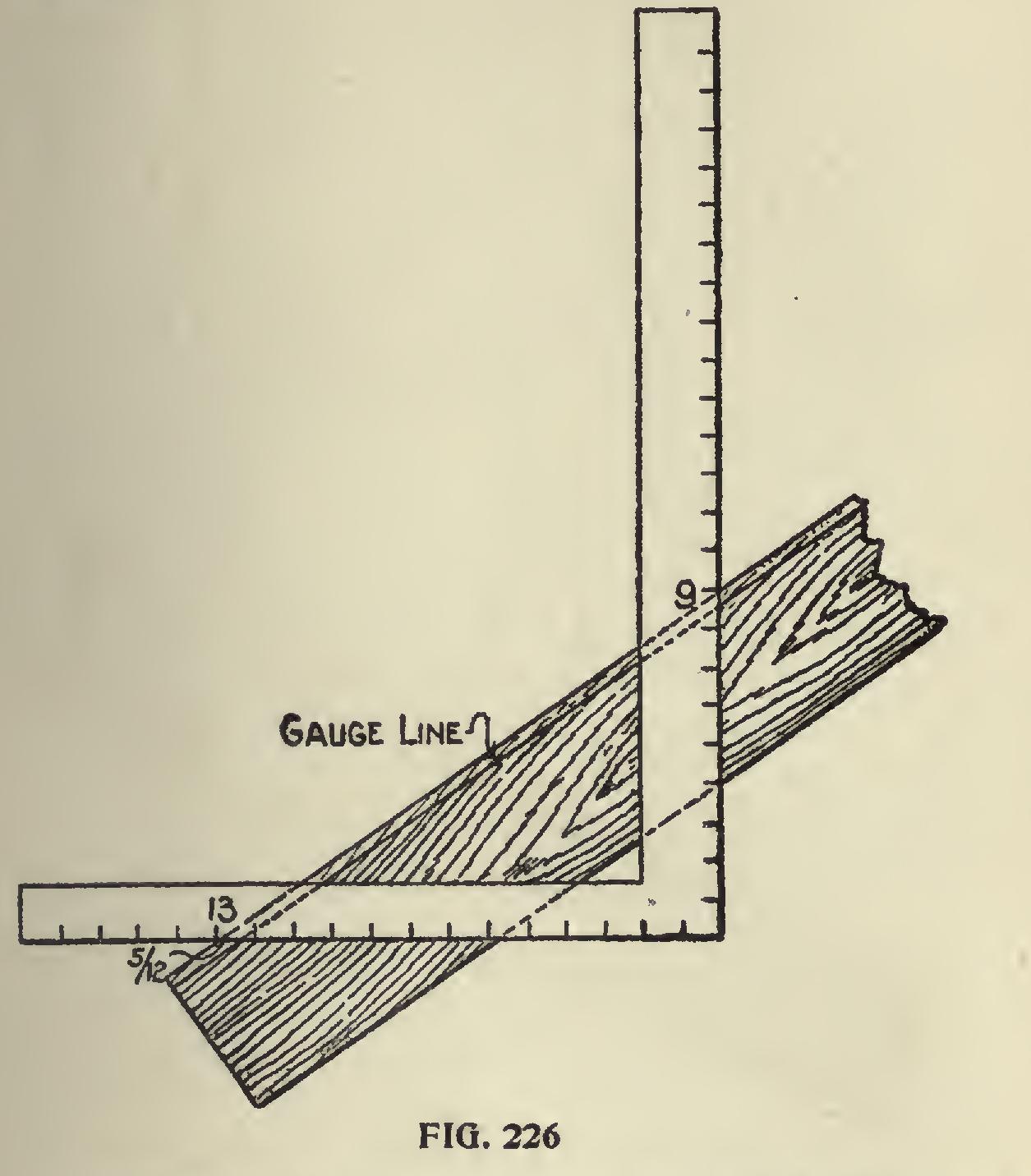 Backing Line for Octagon Hip.—We show in Fig. 226 the backing line for the octagon hip. From this, it will be seen, that the method is the same as that for the hip resting on a square cor ner, which is shown in Fig. 225. In this 17 and 9 give the seat and plumb cuts for the s pitch while 13 and 9 give the corresponding cuts for the octagon hip. In the former a point 12 twelfths or one inch, is taken back from the edge of the rafter along the seat cut for the gauge line, while in the latter, the point is taken 5 twelfths back. The backing for any other polygonal hip may be readily found in the same way by setting off the tangent for one-half the thickness of the hip. Thus for the hip resting on a square corner, the tangent is equal to one-half of the thickness. In other words, the amounts to set off are the same figures as those used to obtain the side cut for the corresponding jack (see the figures opposite the blade in Fig. 223), but consider them as so many twelfths of an inch. Thus it is 12 twelfths, or one inch, for the square-cornered building, 81 twelfths for the pentagon, 7 twelfths for the hexagon, 5 twelfths for the octagon. The figures to use for other polygonal roofs are shown in Fig. 223, but the reader must bear in mind that the fractional part of the number becomes only that part of a twelfth on an inch. Thus, for the octagon the number is 4 23-24, which is lacking only 1-24 of a twelfth of an inch of being 5 inches. This is so near being 5 that we call it 5 twelfths of an inch for the amount to set off on the seat cut line as before described and shown in Fig. 226.