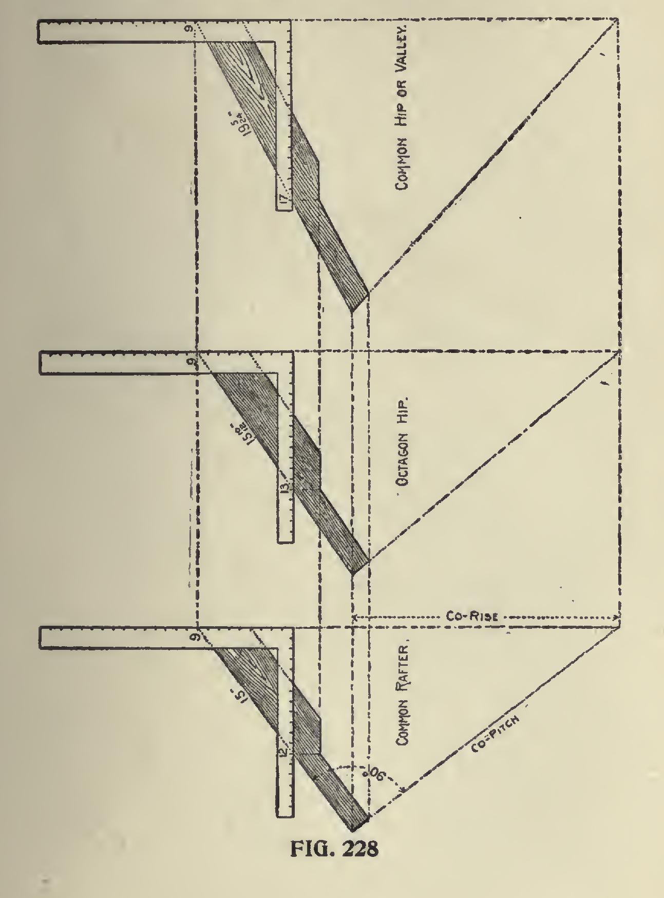 In Fig. 227 we show this cut as at "A" and how it may be obtained with the steel square. From this, it will be seen that it is rather a diffi cult thing to get at, since the measurements are, so to speak, in another latitude. In all roofs there is an unseen, or co-pitch, and the end cut of the common rafter represents that pitch, and which, if cut square, will rest at 90 degrees from the given pitch of the common rafter, and the cut in question must necessarily coincide with the unseen or co-pitch.