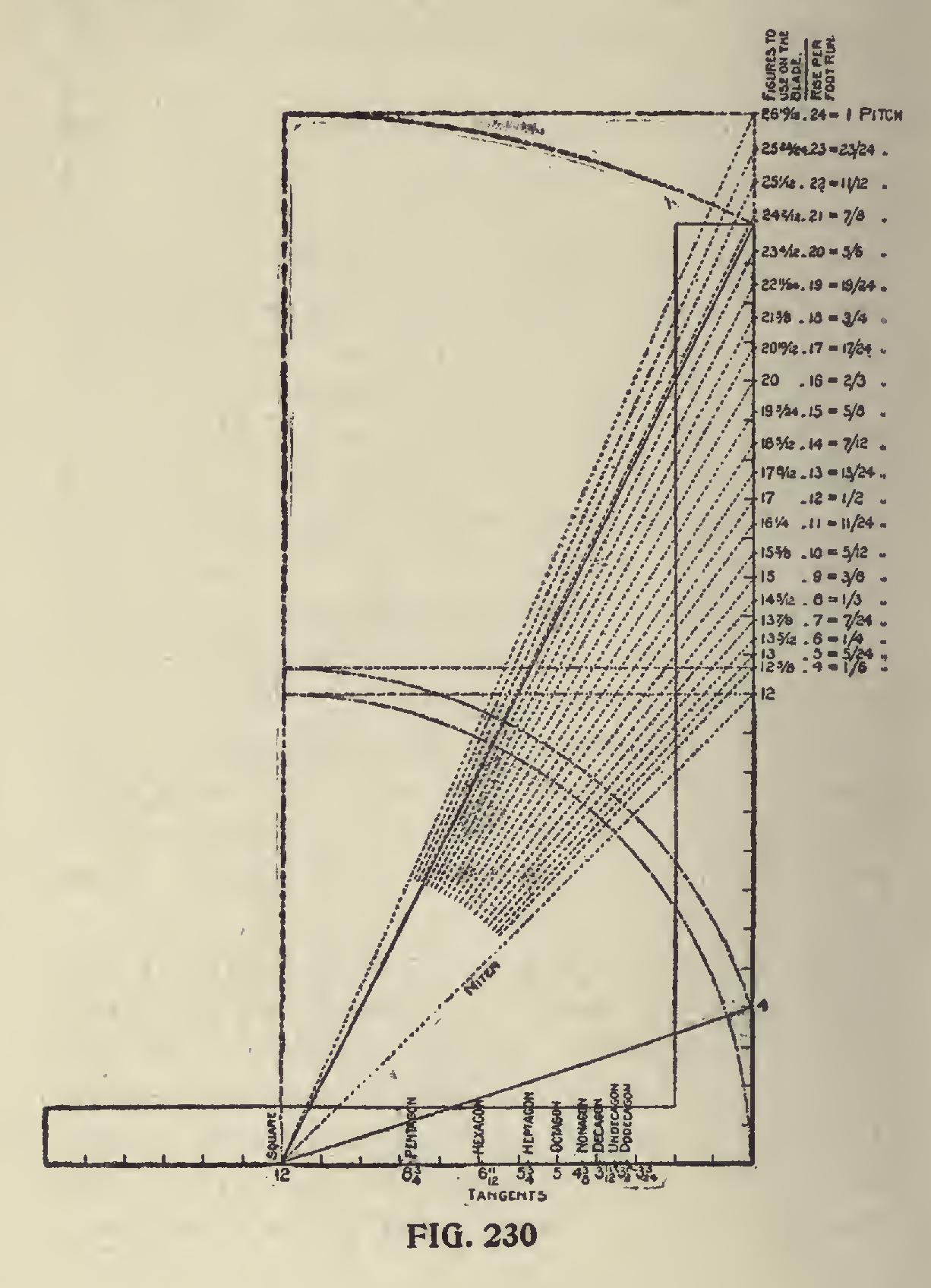 Side Cut of Jacks.—In Fig. 230 we show the side cut of the jacks from a 4 to 24-inch rise to the foot run and for polygonal corners from 4 to 12. In this illustration we show the figures to use on the steel square for twenty of the pitch lines and for the square corner and eight of the polygonal jacks, also for the level miter making in all 220 side cuts, or miters, that can be had from this illustration alone. Since the tangents of the polygons govern the figures to use on the tongue, they are as shown in connection with this illustration. Thus, to obtain the side cut of the pentagon jack for the Finch pitch, we use 81 on the tongue and 15 on the blade. The blade giving the cut.