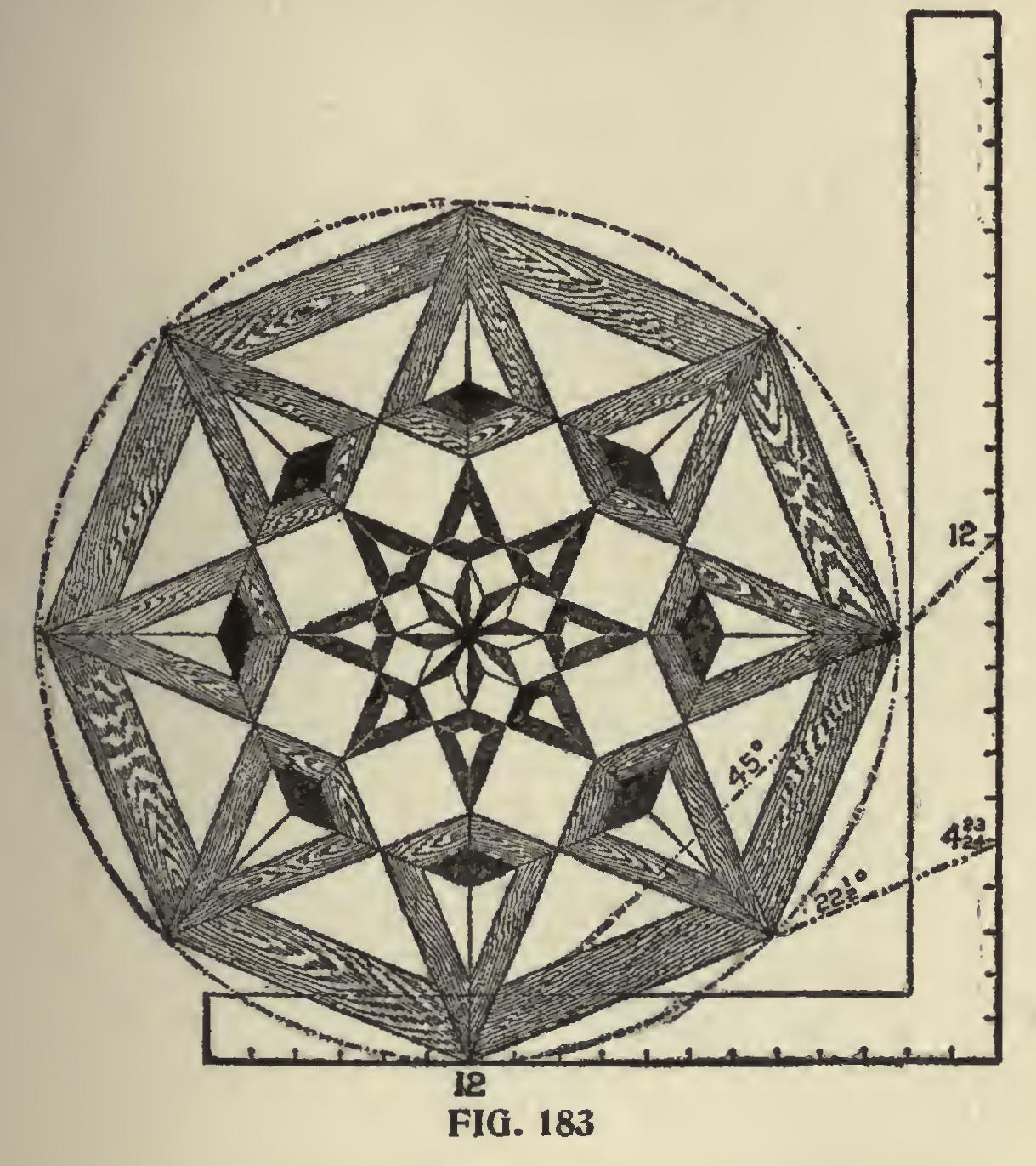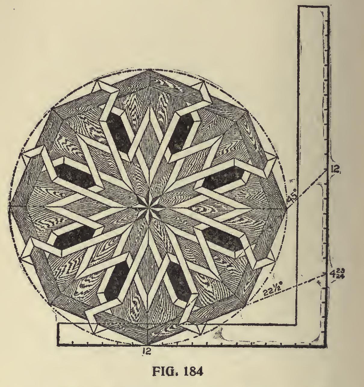 In Figs. 183 and 184 are shown patterns suit able for parquet or inlaid work. All of the miters contained in these designs can be had on the 22i and 45-degree lines and the figures shown on the square when applied will give all of the angles as well as the miters contained in these illustra tions.