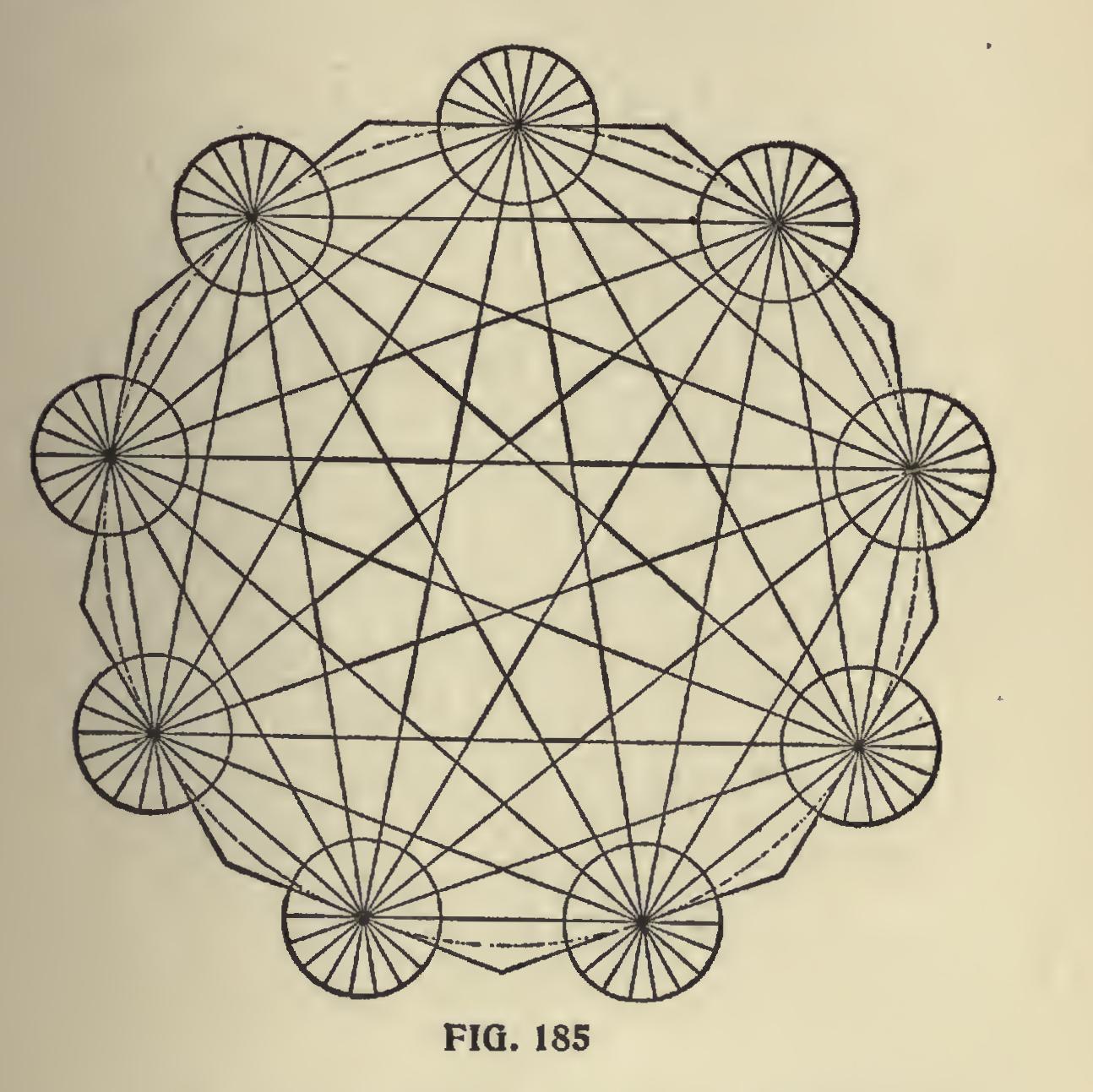 In Fig. 185 is shown an example in line work for the nonagon or nine-sided polygon. We have not shown the square in connection with this illustration, but the figures to use are for the 20 degree, because 9 is contained in 180 twenty times. The small circles are divided into eighteen parts because 20 is contained into 360 degrees eighteen times. A further explanation of this illustration would be useless, as it shows for itself.