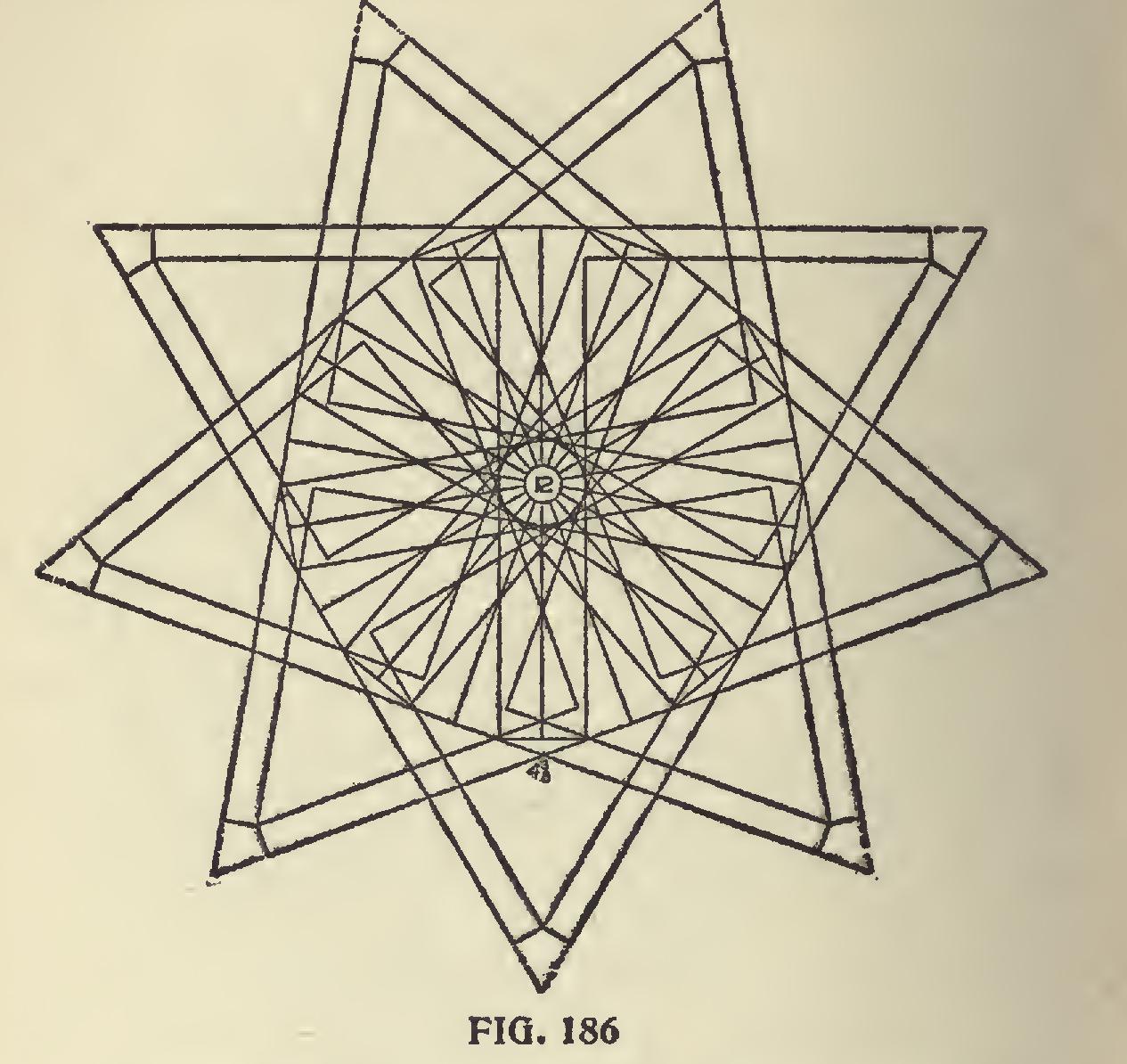 In Fig. 186 is shown a very pretty design made with eighteen squares. In this the center is at 12 on the blade and the intersection at 41 on the tongues, which is at the 20-degree line and rep resents the nonagon as will be seen by the forma tion of the tongues at the intersections. By extending the lines from the tongues as shown by the dotted lines will form a nine pointed star.