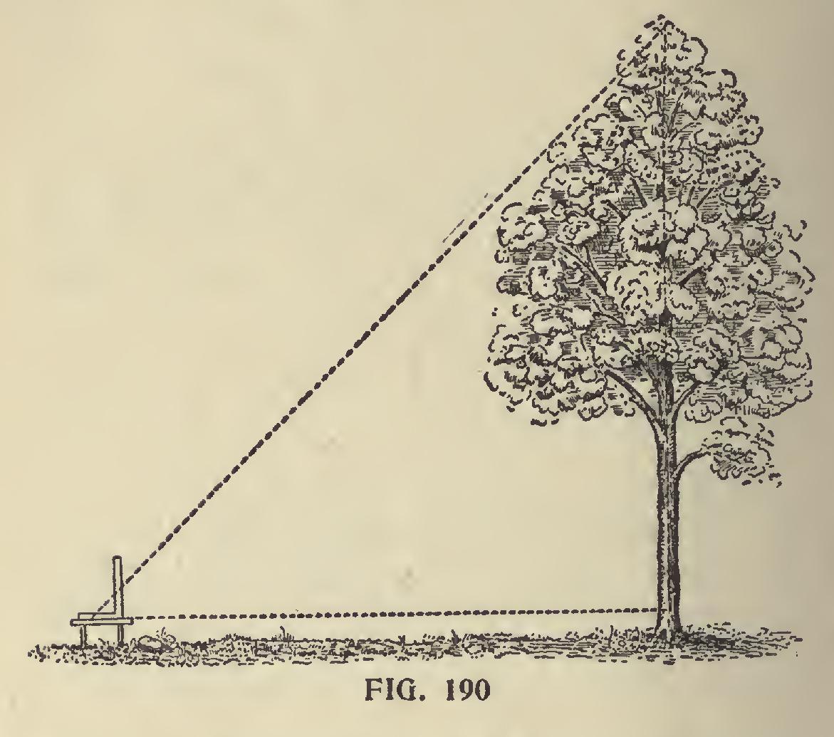 To Find the Height of a Tree.—Fig. 190 illus trates how a tree or inaccessible height can be measured on the same principle with the aid of the steel square. Take a straight-edge and fasten at any of the equal figures on the tongue and blade. Level and set as shown, and the base will be equal to the perpendicular.