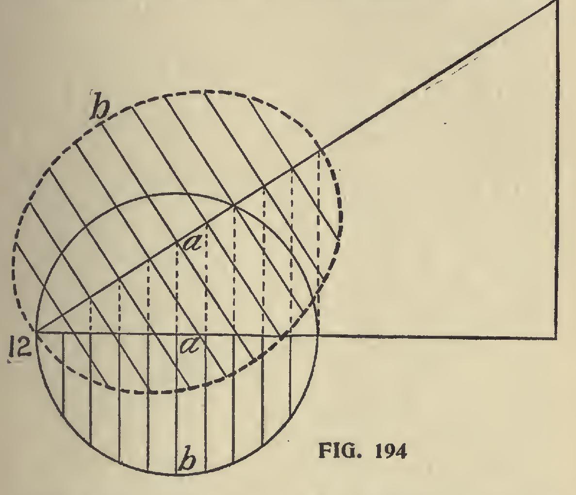 There are several ways of finding the correspond ing opening. Probably as good a method as any is that shown in Fig. 192, which is as follows : Take a straight edge, and on *it space off A, B", C", as shown in Fig. 191. Now draw a line equal to the long dia meter, C D, and bisect it at right angles, and to these lines apply the straight-edge, as shown in Fig. 192. Always keeping B C on the lines and marking at A will describe the required opening. The steeper the pitch the longer will be the required opening. In Fig. 193 is shownthe same formula, but with the one-third pitch and a 10-inch pipe. Fig. 194 shows another method of obtaining the opening, which is as follows : Lay off the run, rise and pitch, and with one-half the diameter of the pipe as radius, with the pencil point resting at 12, and center on run, draw a semi-circle. Divide the diameter into any number of spaces and through these run lines at right angles with the run from the circle to the pitch. At point of intersection on the pitch draw lines on either side at right angles and on this meas ure equal the length of the corresponding lines of the semi-circle, as at A B. Run an off-hand curve, touching these points, and you will have the required opening.