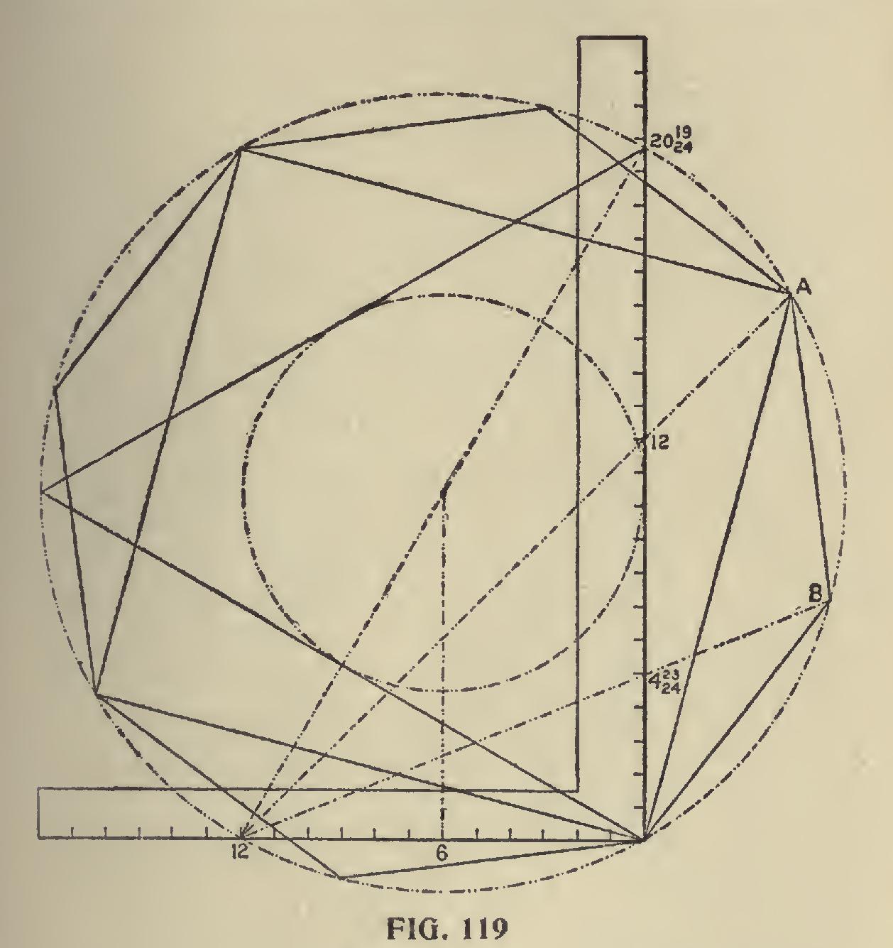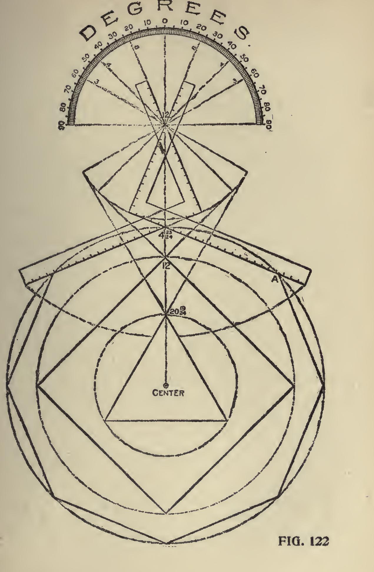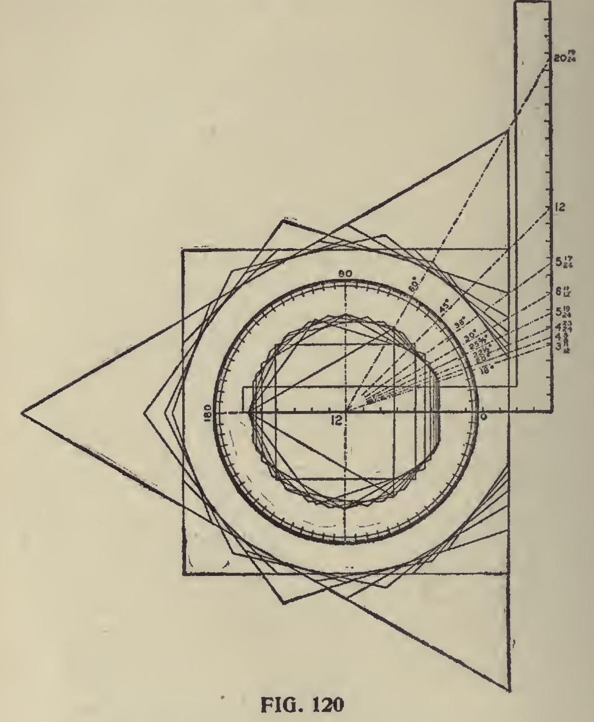 In Fig. 120 are shown two sets of polygons in connection with the degrees and according to the scale, the inner set is drawn to a circumscribed diameter of one foot, while the outer set is drawn to an inscribed diameter of nineteen inches. The starting point in either case is at midway of the sides of the polygons, and the more drawn, the more nearly a true circle they will form. In the former, the corners form the circle and in the latter the central part of the sides lends to the shaping of the circle.