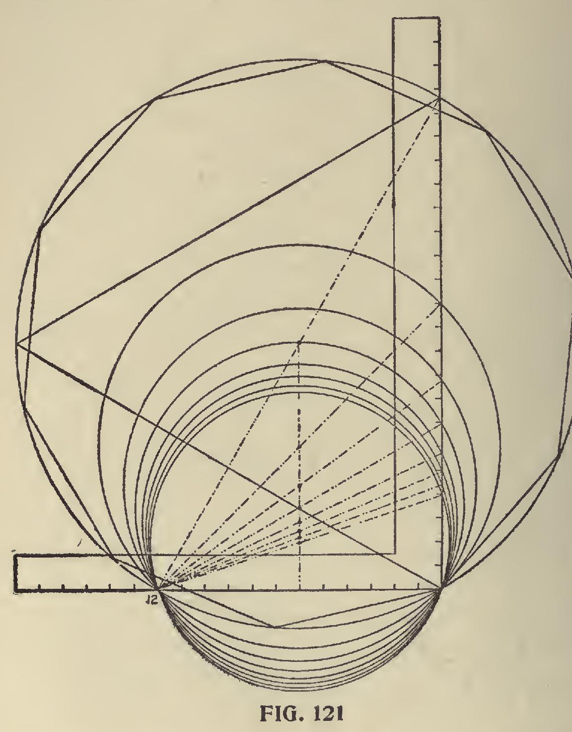 In Fig. 121 are shown the polygon circles. In this illustration each polygon has its individual circle. Beginning with the triangle we show the miter lines for eight of the polygons and by squar ing up from 6 on the tongue and at the intersec tions with the miter lines determine the center of the circles. The reader will notice that each circle cuts at three points on the steel square, also notice the dropping down of the circles and the shadows they cast at the two lower points of the steel square. At first glance it might appear that the circles are not true, but a more careful inspection would show that they are as true as can be described with the compass. The descent of these circles from the triangle down to the decagon is quite rapid, but from this on down it would be a very different thing. The miter lines of a polygon having 180 sides would intersect the blade at one degree, or .21 which is less than one-fourth of an inch, and would be the length of the sides of the polygon with an inscribed diameter of one foot. The miter line for a polygon having 360 sides would intersect the blade at .10476. From this it would appear that the con tinued increase of the sides of a polygon of this size would become too short to be discernible, yet according to trigonometry they could go on and on multiplying in number of sides and the decimal would never be entirely disposed of, leaving it in the infinitesimal or where the polygon really ends and the true circle begins.