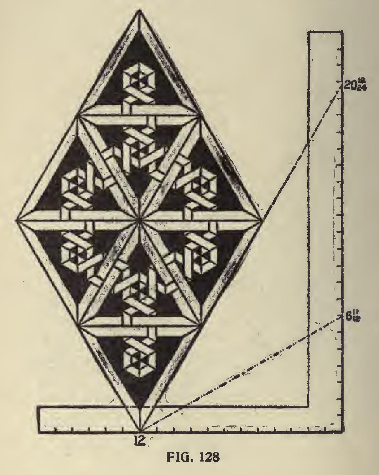 In Fig. 127, is shown a hexagonal figure in general design and all of the miters can be had on 12 and 6 11-12 as indicated on the square. The blade giving the hexagonal and the tongue the triangular cuts. This proportion, of course, the reader will understand, taken at any other part on the blade and tongue would give the same result, as every fractional part of the divisions on the blade represents a scale, but we will not take the time now to explain. The same cuts exist again at 12 on the tongue and 20 19-24 on the blade, but the cuts on the square are just the reverse.