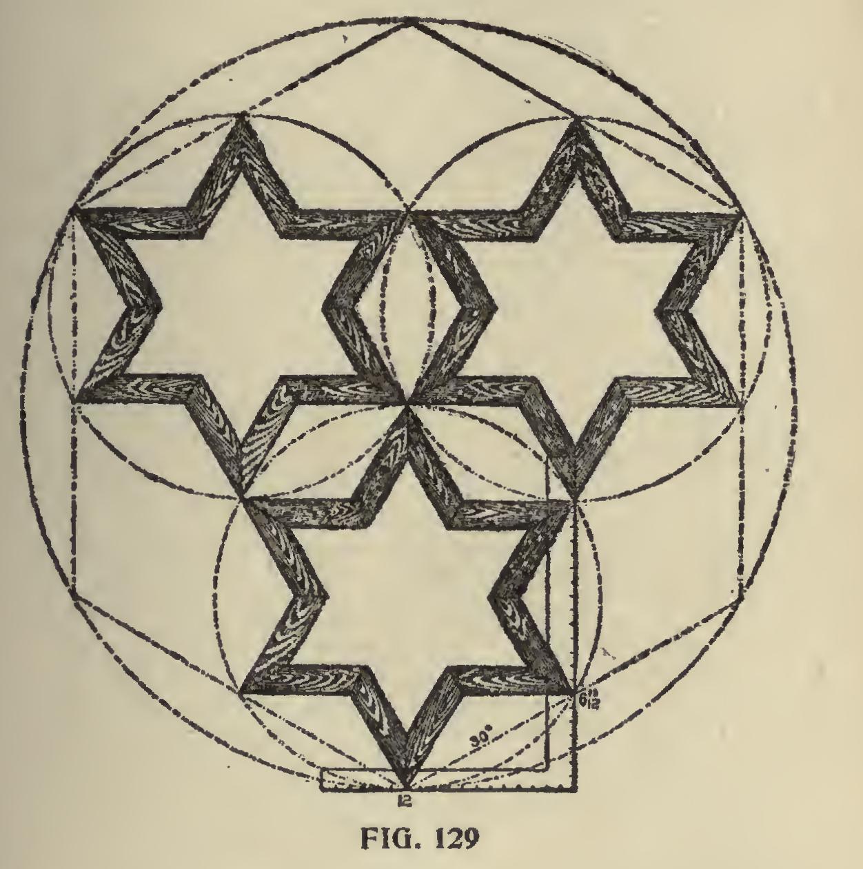 In Fig. 128 is shown another design and is worked on the same degree lines as in the previous figure; what we said of that figure is just as appli cable to this figure. Either of these designs furnish good examples for inlaid work and with , care in selection of color of wood would make a very attractive piece of work.
