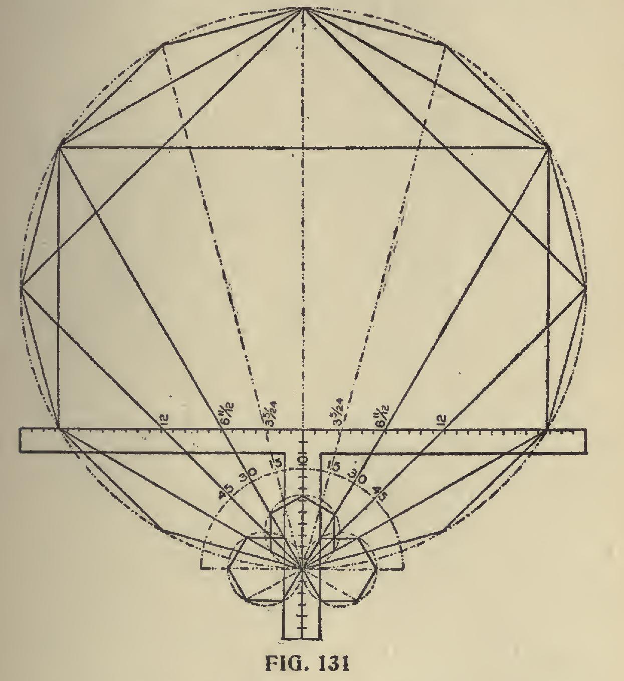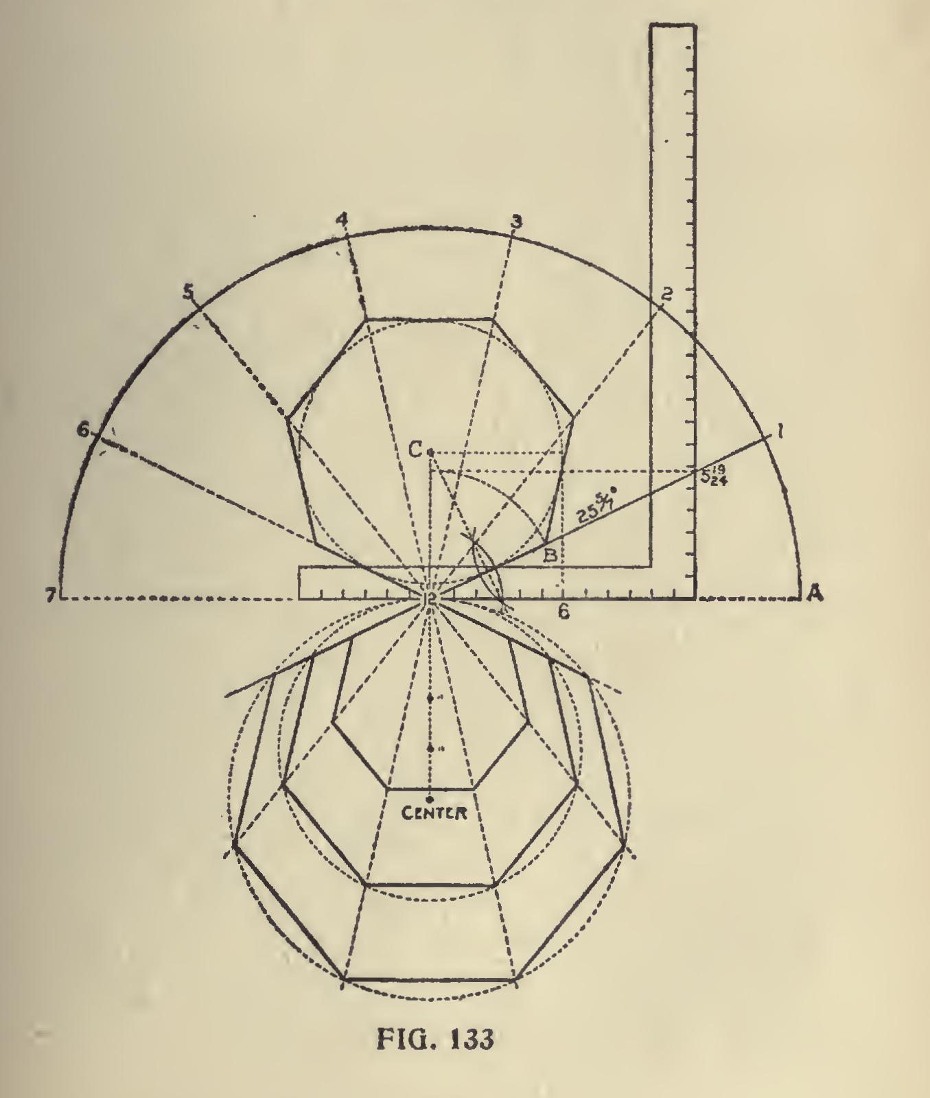In Fig. 133 is shown a diagram whereby the angles and dimensions for any of the polygons may be accurately drawn by a system of lines passing through .12 on the tongue of the square.
