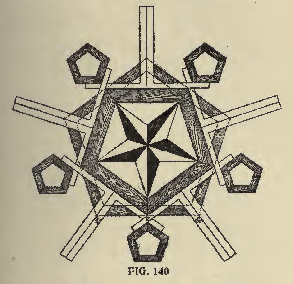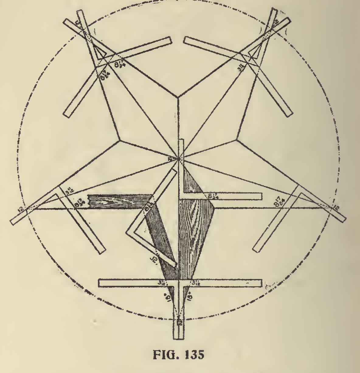It will be seen that a star-shaped figure can be systematically framed either in the solid or in part, as shown, and that without first laying out a full-sized diagram, and the ten pieces will fit to their respective places. The figures 12 and 8 17-24 also furnish the basis for framing a root of this shape, and the general rule that applies to this, applies to all angles.